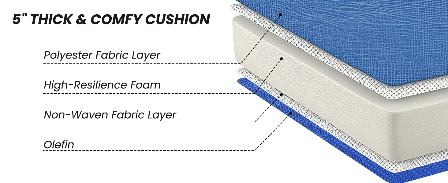 Comfortable High-Density Foam: Engineered with 5" extra-thick.Twice as thick as standard outdoor mats. When you sit on our outdoor lounge chair cushions, it feels as soft as clouds.This quality foam provides good resilience and support, maintaining its shape for comfortable.