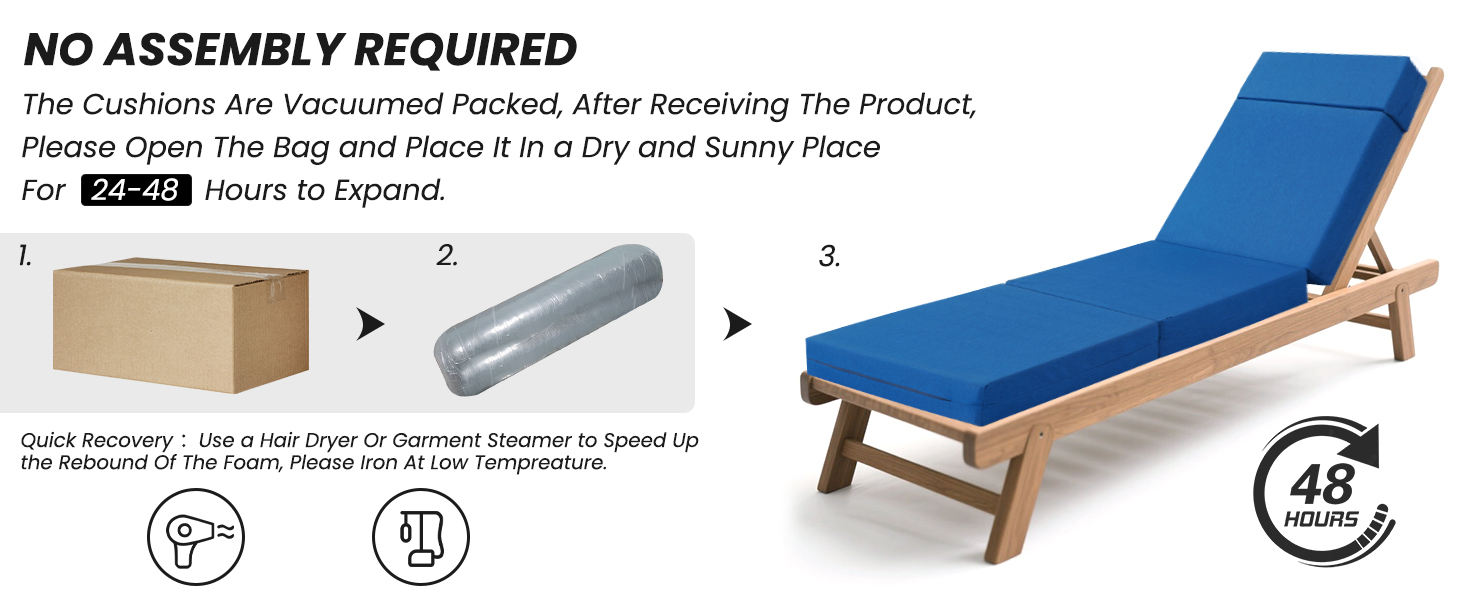 Easy Assembly & Care: This outdoor lounge chair cushions arrives in a compressed package for simple and rapid assembly, without the need for any special tools. Both seat and back cushions have removable covers, making daily cleaning convenient. The covers can be machine washed or hand washed; air drying is recommended