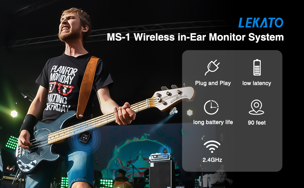 The LEKATO MS-1 Wireless in-Ear Monitor System comes with a 3.5mm cable and 6.35mm adapter, which is available for sound card,mixer, metronome and other devices. 2.4GHZ WIRELESS IEM SYSTEM, Low interference, low latency, high-quality sound quality. Come and experience it now!
