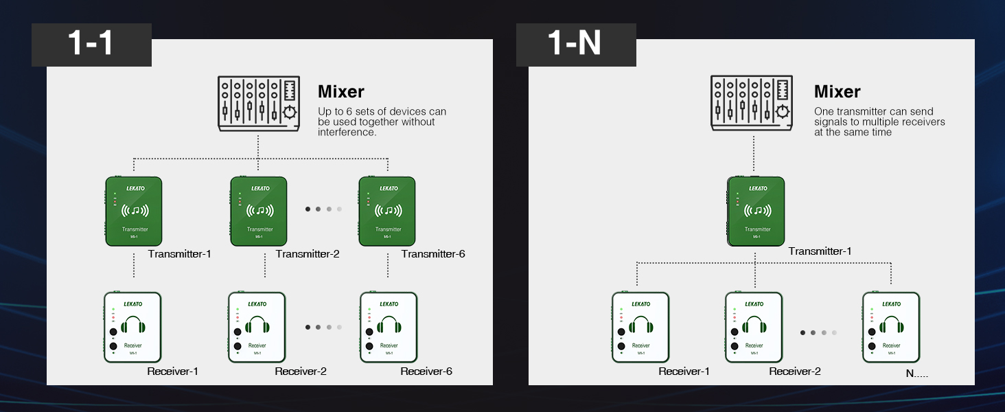One to More Multiple Receivers can be paired with one TX at the same time Support up to "6" sets of devices can work simultaneously at the same time meet needs of small/medium stage performance and daily practice