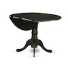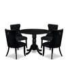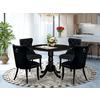 EAST WEST FURNITURE - DLDA5-BLK-24 - 5-PIECE KITCHEN DINING TABLE SET The 5-Piece Kitchen Table Set comprises a round wooden table with convenient drop leaves and 4 upholstered chairs, ensuring optimal comfort for your dining guests. Its adaptable design allows for seamless adjustment of the table's size to accommodate varying guest numbers, rendering it equally suitable for intimate dinners and larger gatherings. This Dining Table Set features a sophisticated black tabletop and legs, enhancing the elegance of your dining area. The dining chairs are upholstered with sumptuous Black Linen Fabric seats, adding a touch of refinement and comfort to any dining space. Its versatile design seamlessly complements a wide range of interior styles, whether your home decor leans towards modern or traditional aesthetics. Meticulously handcrafted from premium-quality Rubber Wood, this Dining table Set exudes timeless charm and exceptional craftsmanship. The use of Rubber Wood not only ensures longevity but also imbues The dining table set with a natural and enduring elegance. It stands as a valuable addition to any home, promising years of delightful dining experiences. The generously cushioned seats offer a cozy and inviting spot for friends and family to convene around the dining table, elevating every meal into a delightful experience. With excellent support provided by the cushioned seats and backrests, it promotes a pleasurable and comfortable dining experience. PRODUCT FEATURES: • Frame Material: Rubber Wood • Frame Color: Black • Table Top Style: Round • Chair Back Style: Button Tufted • Fabric Material: Linen Fabric • Fabric Color: Black • Chair Dimension: Length: 19.5; Width: 24; Height: 38 • Table Dimension: Length: 42; Width: 42; Height: 29.5. Included in the Package: 4 Upholstered Dining Chairs and a Kitchen Table.