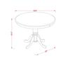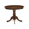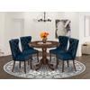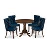 Upgrade your dining space with our compact and stylish dining table set, perfectly designed for small spaces. This thoughtfully crafted ensemble includes a round kitchen table and 4 parson kitchen chairs, combining form and function seamlessly to enhance your dining experience. Crafted from durable Rubberwood, this dining set promises longevity and a timeless appeal. The Antique Walnut finish adds a touch of warmth and sophistication to your space, making it a welcoming focal point for intimate gatherings and cozy meals. The Round kitchen table takes center stage with its unique shape, adding a touch of elegance to your dining area. Supported by a sturdy pedestal base, it not only exudes stability but also provides ample legroom for you and your guests. These stylish and comfy chairs feature a chic Navy Blue faux leather upholstery that not only adds a luxurious touch but also simplifies maintenance, ensuring they look pristine for years to come. The nail head detailing along the edges adds a hint of sophistication, while the chair pull handles on the back make positioning and moving them effortlessly. The curved front legs not only contribute to the chair's stability but also enhance its aesthetic appeal. Most importantly, the ergonomic sitting position ensures that you and your guests can enjoy long, comfortable meals without stress. Whether you're sharing a cozy meal with loved ones or hosting a small gathering of friends, this dining set is the ideal choice. DINING TABLE FEATURES: Material: Rubberwood Shape: Round Base: Pedestal Finish: Antique Walnut Dimensions: Length: 36; Width: 36; Height: 30 DINING CHAIRS FEATURES: Chair Type: Parson Chair Frame Material: Rubberwood Finish: Antique Walnut faux leather Type: faux leather faux leather Color: Navy Blue Dimensions: Length: 19.5; Width: 24; Height: 38 INCLUDES: A Round Dining Table and 4 Parson Chairs.
