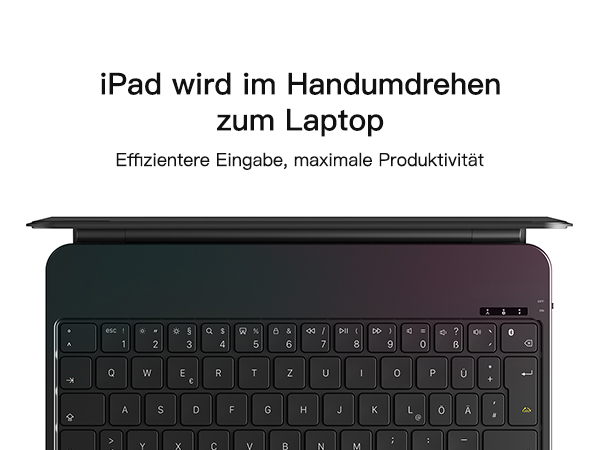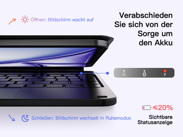 Mehr schillernde Farbhintergrundbeleuchtung als die offizielle iPad magnetische Tastatur,beleuchtet Ihre Tasten mit leuchtenden Farben. Stellen Sie zwischen drei Helligkeitsstufen ein, um Ihrer Stimmung zu entsprechen - sei es enthusiastisch, warm oder dezent. Genießen Sie bis zu 12 Stunden Hintergrundbeleuchtung für Ihre wöchentlichen Bedürfnisse.