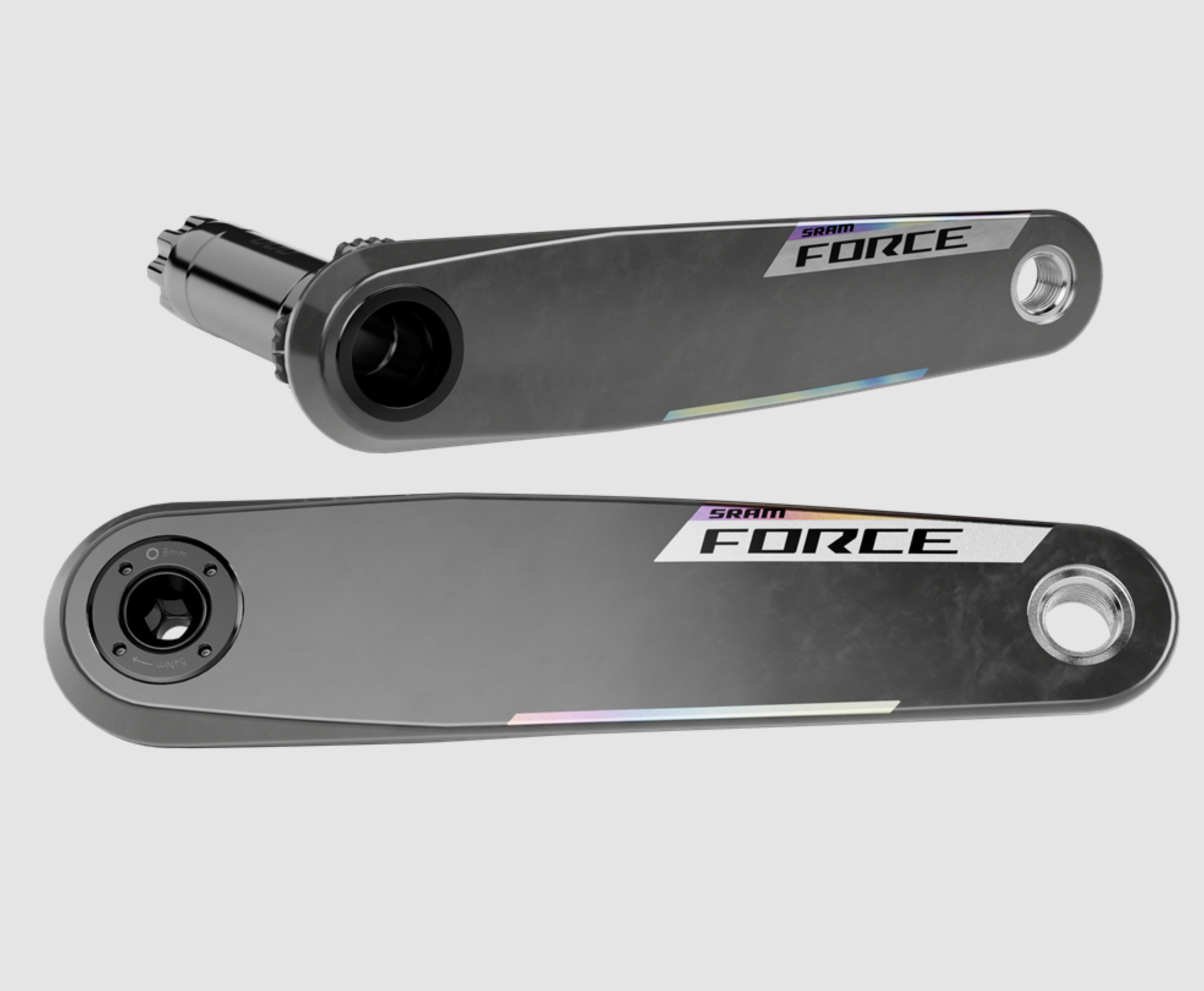 Form and function. The design of the Force crankarm is a wonder of carbon; light and stiff to effortlessly propel you forward. The 8-bolt interface will fit any SRAM AXS spider or integrated chainring, with or without power. The light, stiff, and durable DUB spindle interface also fits nearly any frame.
