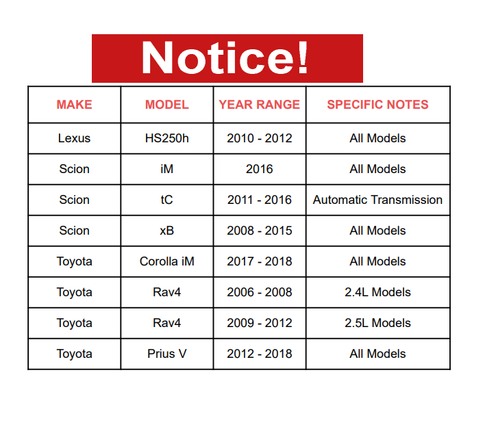 | Toyota | Corolla iM | 2017 - 2018 | All Models |