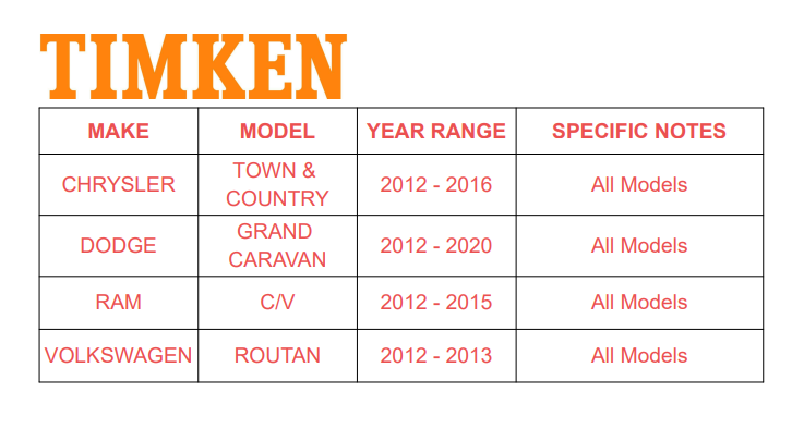 | CHRYSLER | TOWN & COUNTRY | 2012 - 2016 | All Models |