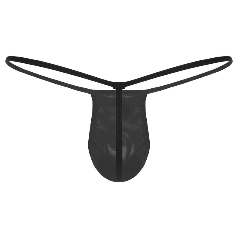 Low rise t-back for men, patent leather bulge pouch, elastic waistband for better fit.