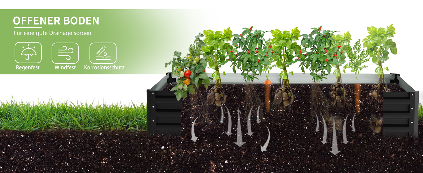 OFFENES BODENDESIGN:Dieses verzinkte Metall-Hochbeet ist mit offenem Boden konzipiert, der effektiv Wasseransammlungen und Fäulnis verhindert, die Pflanzenwurzeln schützt und es den Wurzeln ermöglicht, Nährstoffe besser aufzunehmen.