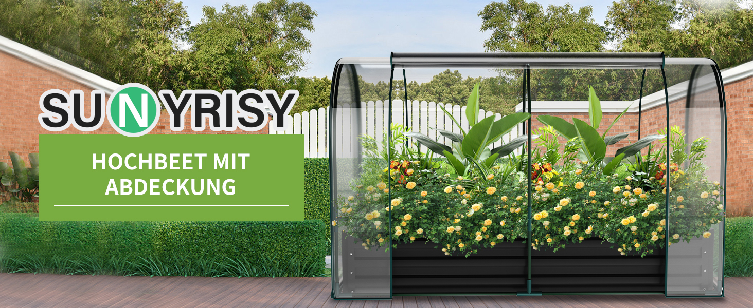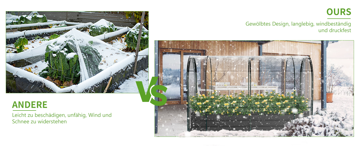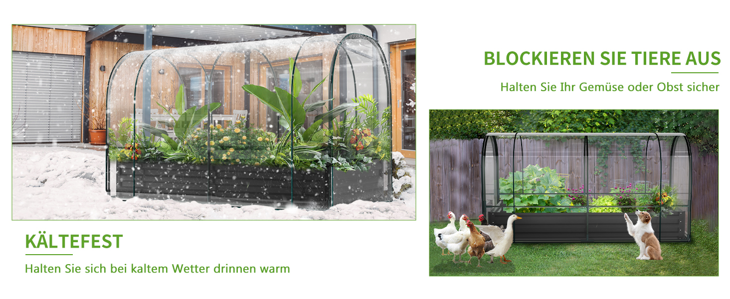 Verlängerte Anbausaison:Die Maße des Beets betragen 180 cm x 90 cm x 30 cm (LBH)., und die Maße des Hochbeets mit PVC-Gewächshaus betragen 185 cm 95 cm Mit 115 cm (LBH). Das angebrachte Gewächshaus schafft eine kontrollierte Umgebung für ganzjähriges Gärtnern. Es hilft, die Anbausaison zu verlängern, indem es Pflanzen vor extremen Wetterbedingungen wie Frost, übermäßiger Hitze oder starkem Regen schützt.