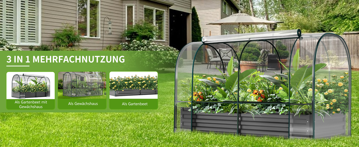 Mehrfunktionales Hochbeet mit Gewächshaus-Set:2-in-1 verzinktes Hochbeet-Set - 1 Set mit 3 Funktionen: Kann verwendet werden als Hochbeet, abnehmbares Mini-Gewächshaus oder Kombination aus beidem. Erfüllt Ihre verschiedenen Bedürfnisse. Durchsichtiges PVC-Material, wasserdicht, feuchtigkeitsresistent & mit 100% Lichtdurchlässigkeit für mehr Sonnenlicht für Pflanzen, hält Pflanzen im Winter warm und schützt sie vor Tieren.