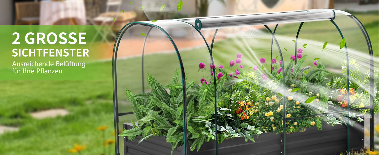 2 große Lüftungsfenster mit Reißverschluss:2 große Lüftungsfenster mit Insektenschutzgitter lassen frische Luft herein und halten Vögel sowie Insekten fern. Sie sorgen für gute Belüftung und ein optimales Pflanzenklima durch Regulierung der Luftfeuchtigkeit. Die Fenster können hochgerollt und mit Haltebändern fixiert werden. Das Gitterdesign ermöglicht im Frühling und Sommer eine optimale Belüftung der Pflanzen, lässt mehr Sonnenlicht herein und erleichtert das Bewässern von beiden Seiten.