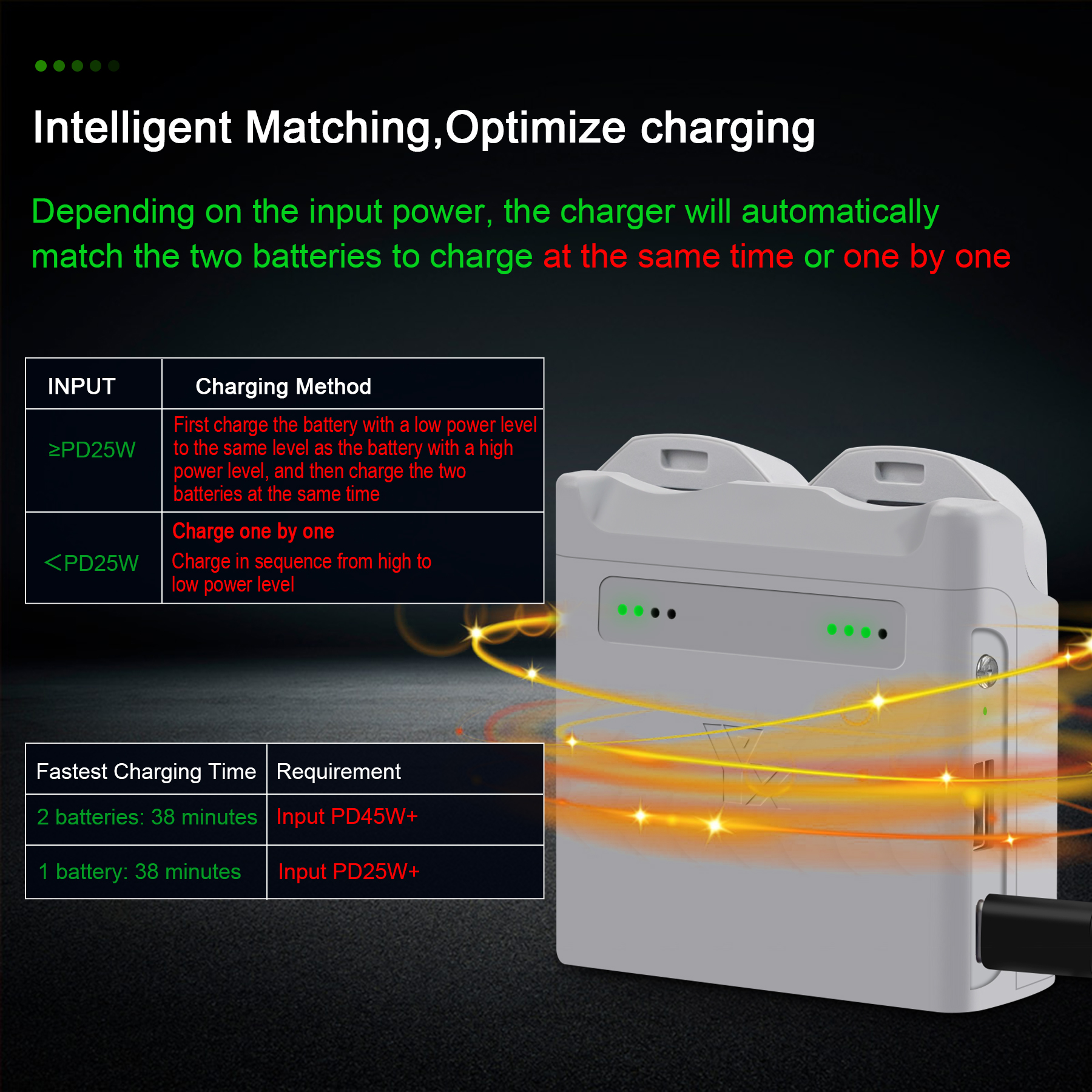 According to the input power, the charger will automatically match the simultaneous charging or single charging