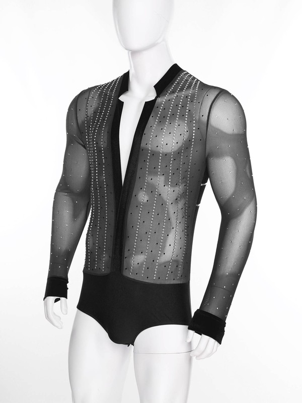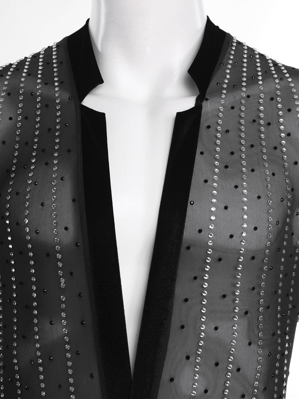Sheer mesh and velvet patchwork with shiny rhinestones decoration bring a luxurious and glamorous feel, making you stand out on the dance floor.