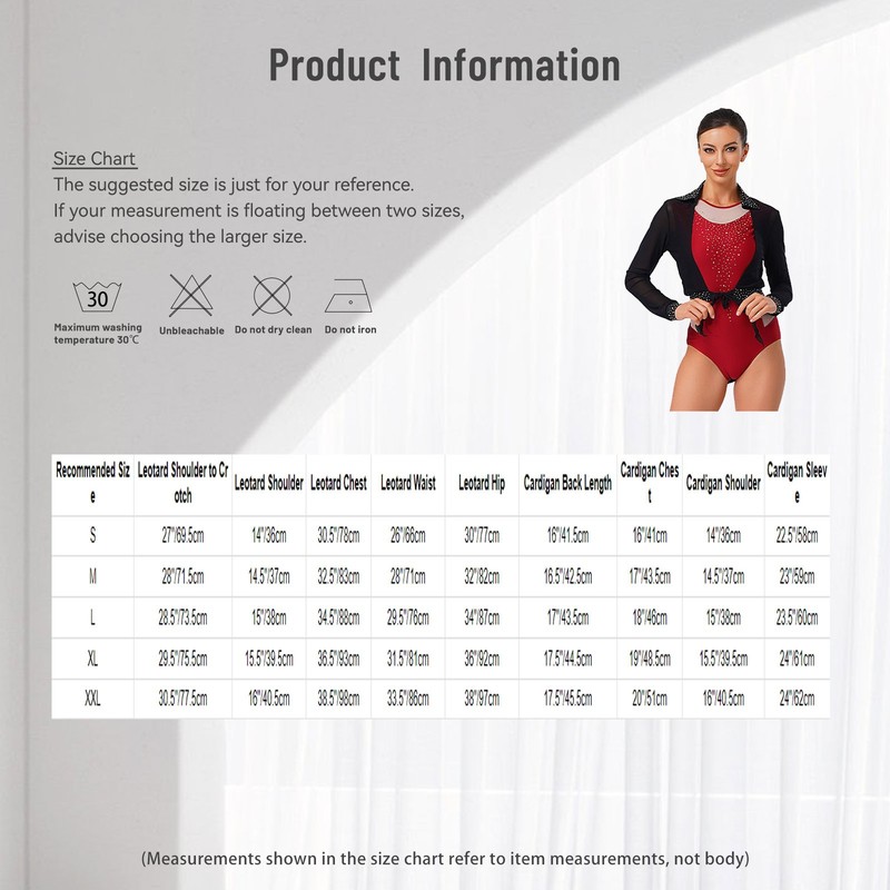 | Tag No. | Recommended Size | Leotard Shoulder to Crotch | Leotard Shoulder | Leotard Chest | Leotard Waist | Leotard Hip | Cardigan Back Length | Cardigan Chest | Cardigan Shoulder | Cardigan Sleeve |