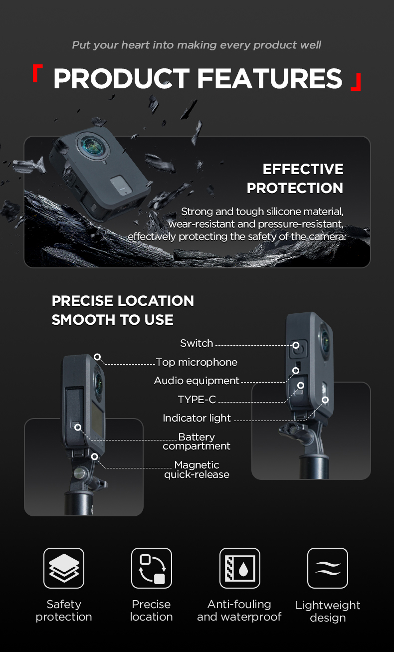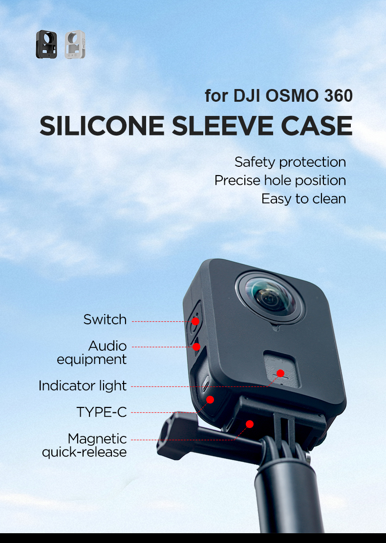 Designed exclusively for DJI Osmo 360, this silicone case features laser-precise cutouts for seamless access to all ports (TYPE-C, battery cover, magnetic mount) while providing complete shockproof protection.