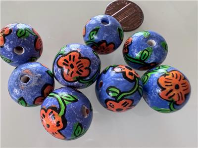 Vintage 15 -16mm hand painted blue with orange flowers beads. The size varies slightly from bead to bead. I'm having a hard time determining what these beads are made of. They are too heavy for wood or plastic, not heavy enough for glass- oh well, there are very nice. 8 pieces.