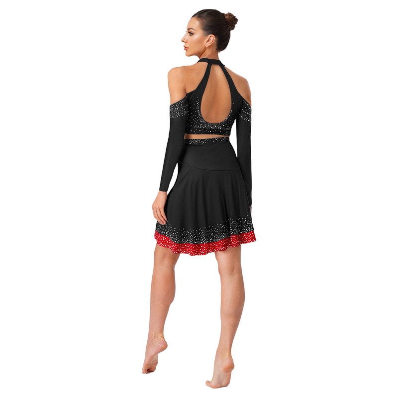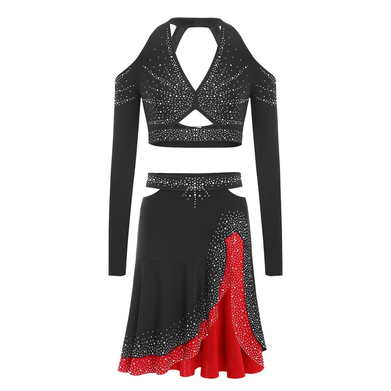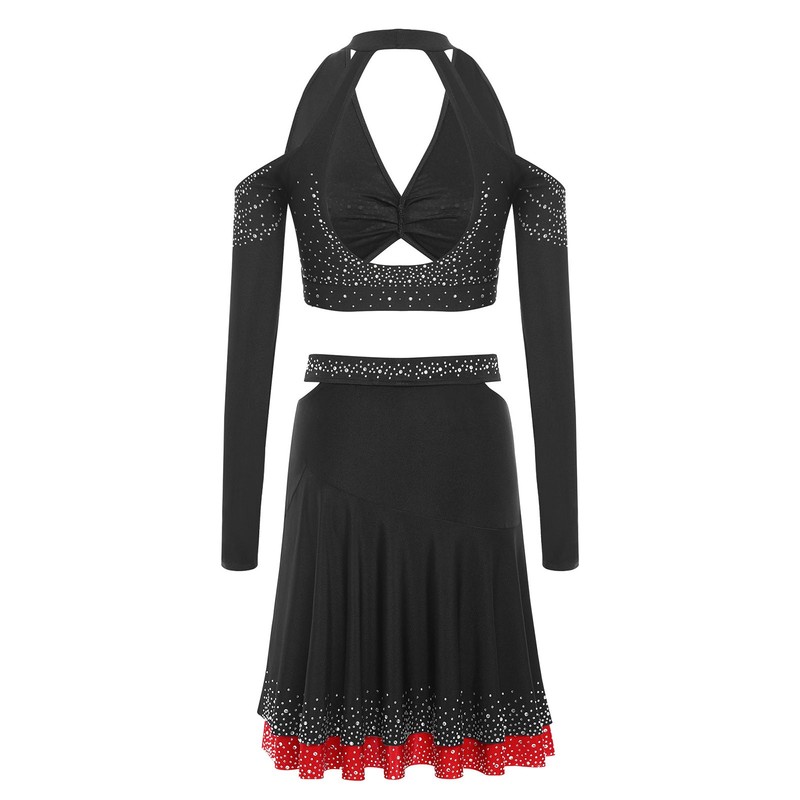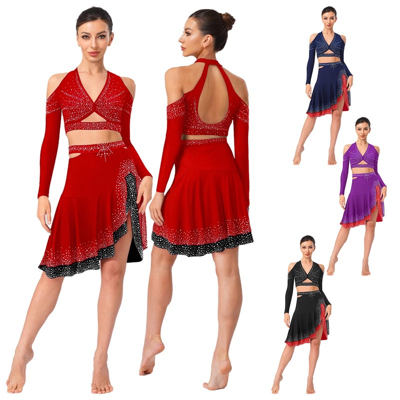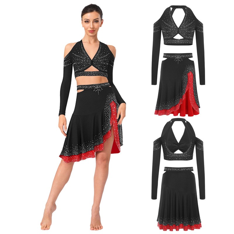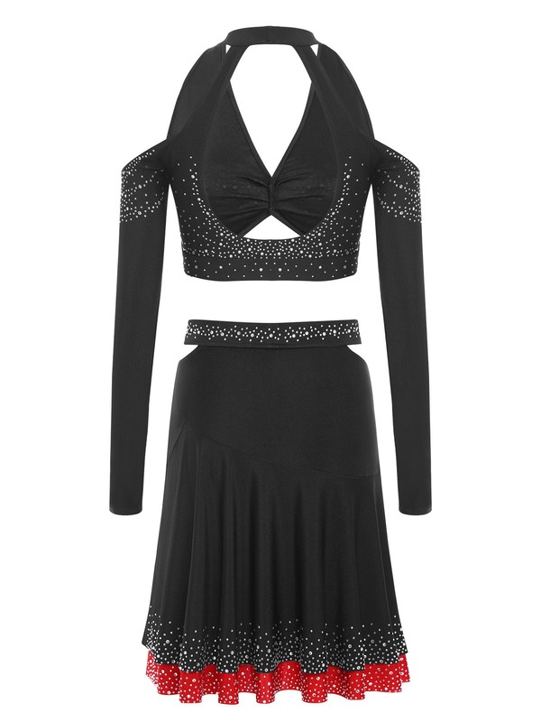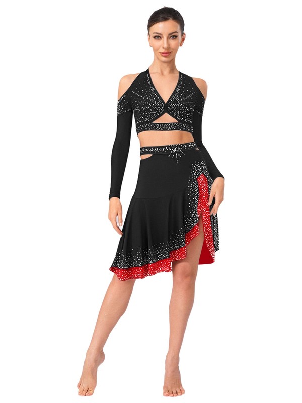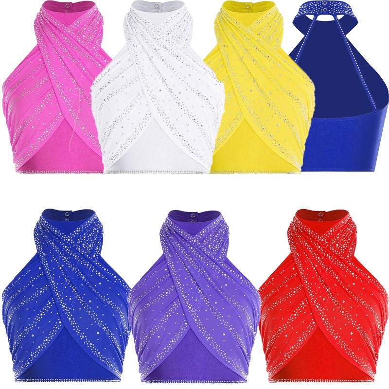 The shiny rhinestones on the halter crop top add a glamorous and eye-catching element, making the wearer stand out on the dance floor.