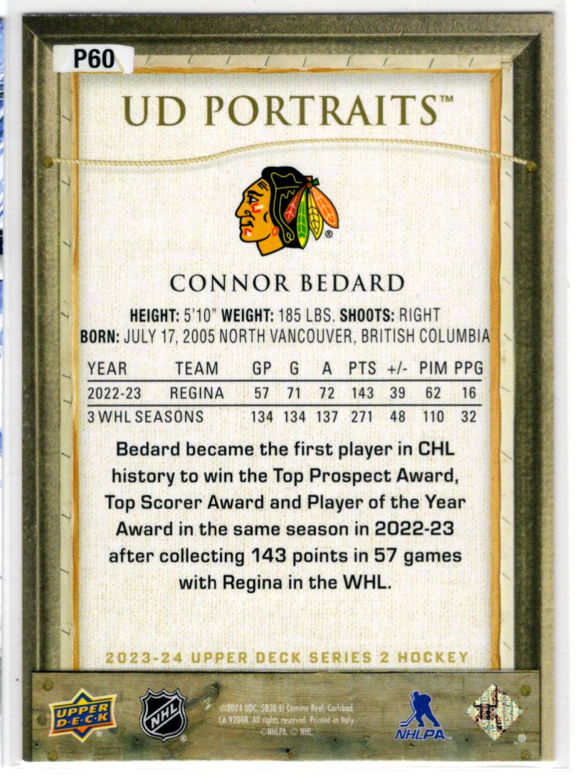 | 2023-24 Upper Deck UD Portraits Connor Bedard Chicago Blackhawks #P60 |
