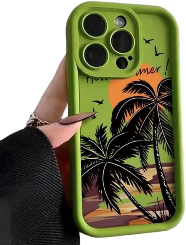 Stylish silicone phone case featuring a vibrant sunset with coconut trees and birds. Drop-proof, wear-resistant, and compatible with multiple iPhone models. Perfect for a summer vibe!