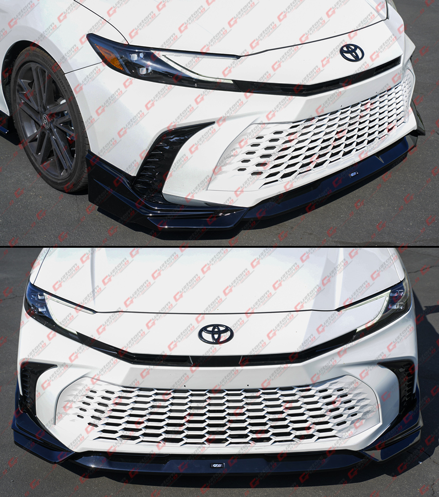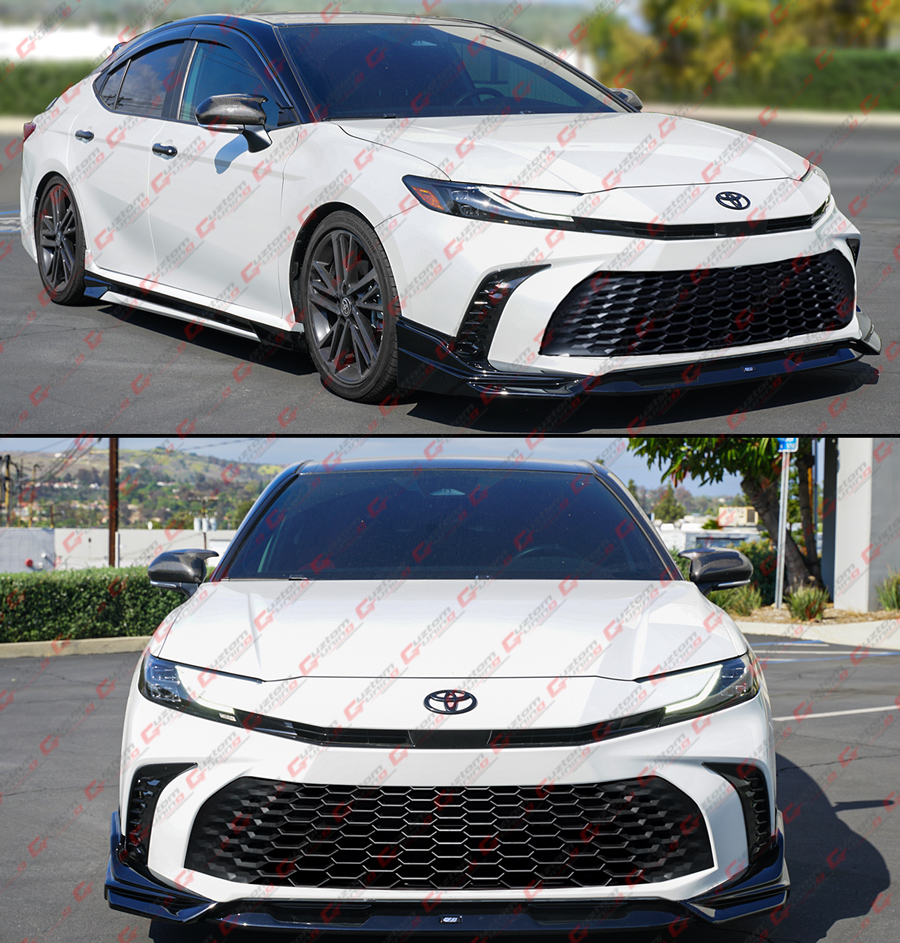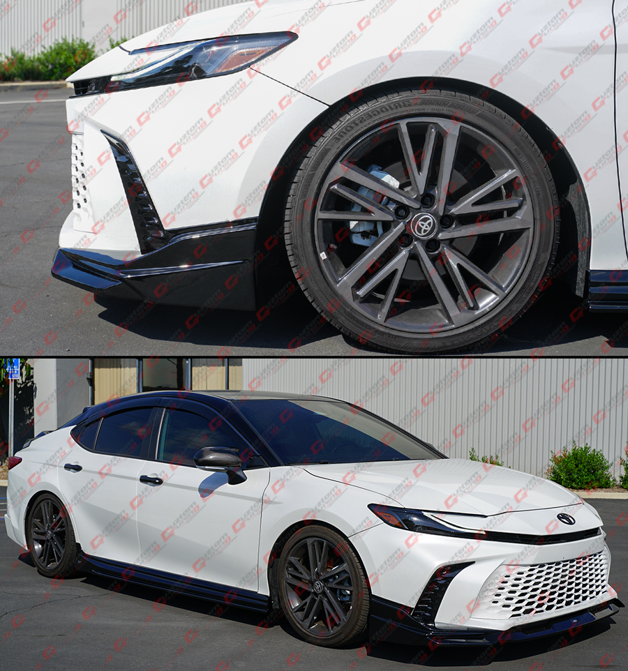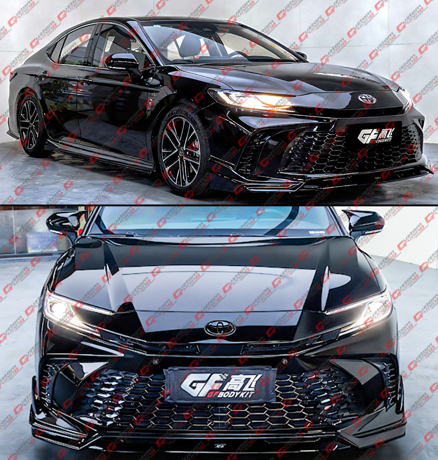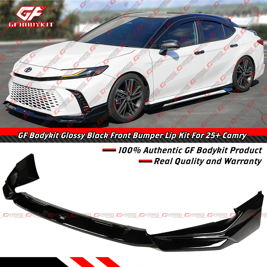 - 100% Authentic GF Bodykit Painted Glossy Black 3-Piece Design Front Bumper Lip Kit For 9th Gen Camry. This Super Unique and Sporty Design Will Give A Lowered Appearance To the Front End As It Will Sit About 1 Inch Closer To the Ground. Item Comes In As 3 Pieces: One Middle Lip & Two Side Splitters. The Kit Also Comes With GF Bodykit Decal In the Middle of The Lip.