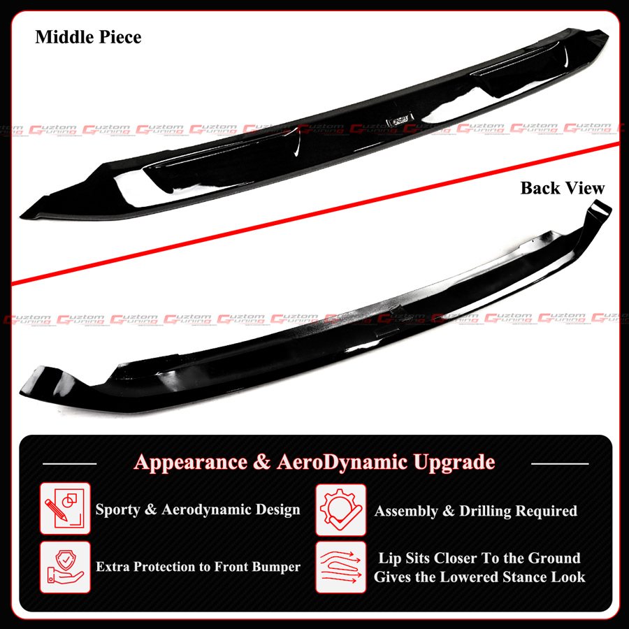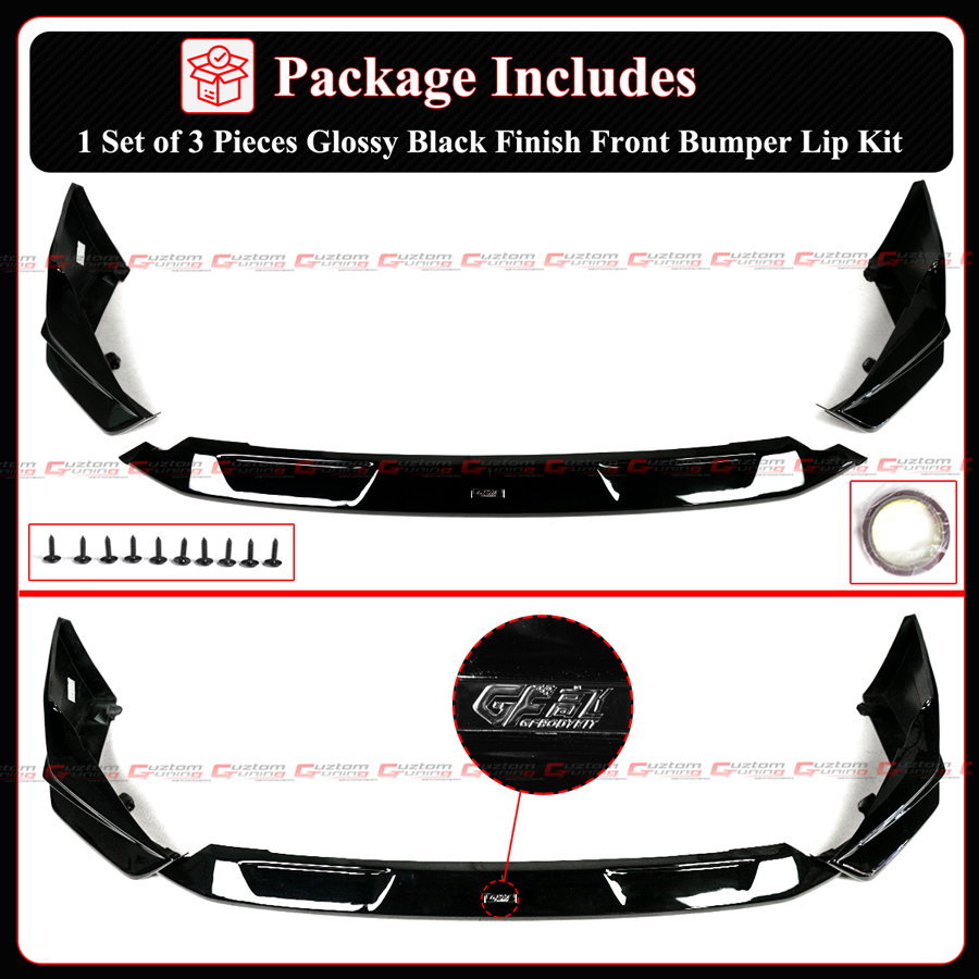 - Package Includes : 1 Set of GF Design 3 Piece Front Bumper Lip Kit With Accessories Shown In Pictures