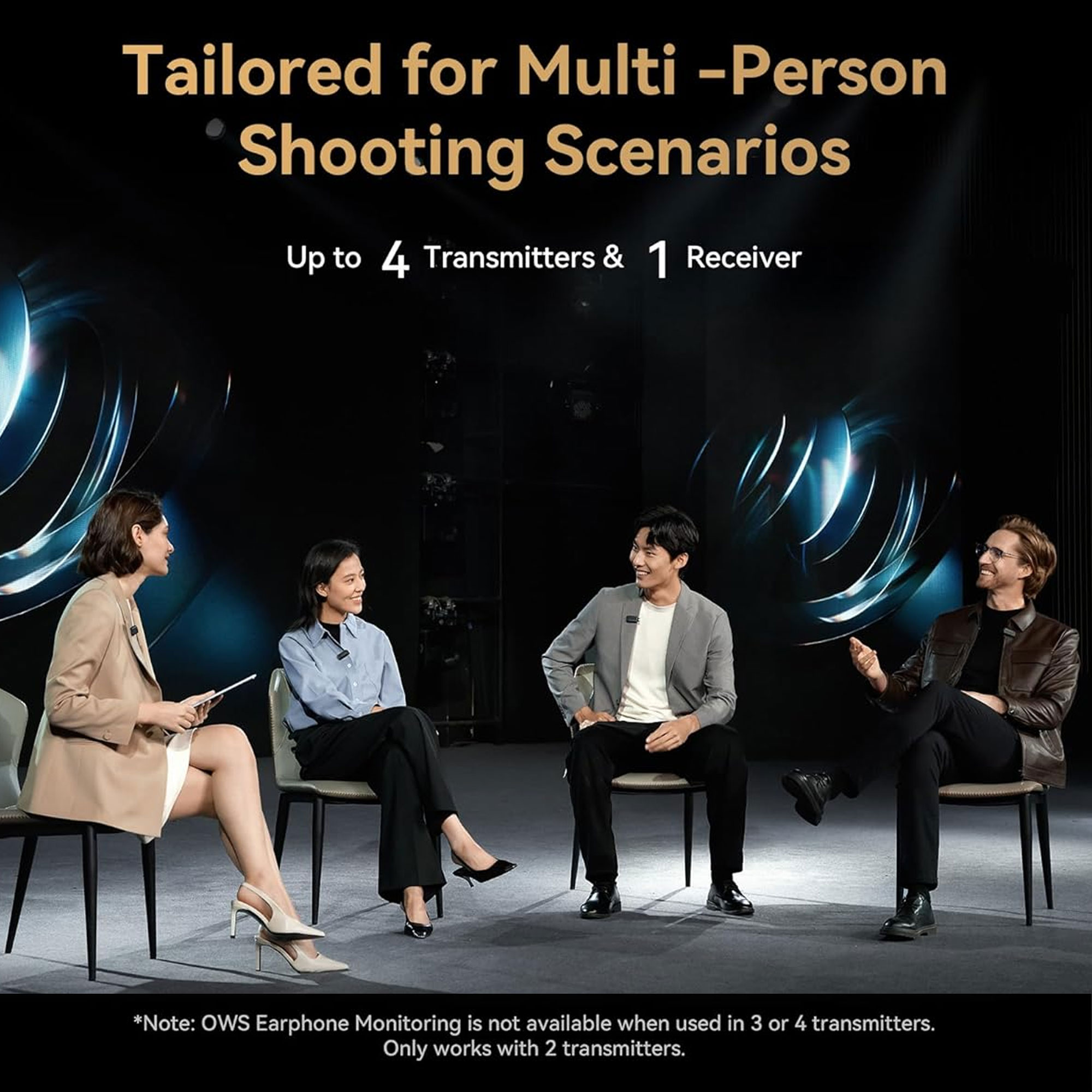 The compact, featherlight LARK MAX 2 transmitter/microphones attach seamlessly to your clothing using an innovative hover-clip design, staying discreetly and stylishly in place. You can also secure them with a magnetic clip, offering flexible wearing options without sacrificing comfort or aesthetics. Weighing just 0.5 oz, each mic is light enough to wear all day without pulling or sagging your clothing. Made from skin-friendly, excimer nano-coated materials, the transmitter/mic feels smooth to the touch and ensures lasting comfort, even during extended use. 32-Bit Full-Chain Audio Transmission Transform your production workflow with the LARK MAX 2’s revolutionary 32-bit full-chain audio transmission. Record professional-grade, 32-bit audio directly into your video, eliminating on-set audio risks and streamlining postproduction. FocalClear Technology for Acoustic Excellence Hollyland’s proprietary FocalClear Technology elevates vocal clarity by zeroing in on your voice, much like a camera lens captures focus. It enhances vocal frequencies while naturally filtering out background distractions, delivering clear, full-bodied sound. Pair the mic with a furry windshield for dual-layer protection dramatically reducing wind interference and ensuring your audio remains untouched by the elements. AI Noise Cancellation: Smart, Adaptive, and Powerful Harness the power of advanced deep-learning with Hollyland’s AI noise cancellation. More than just noise reduction, this intelligent system “listens” like a human trained on vast datasets to distinguish speech from background noise. Automatic Gain Control: No More Clipping or Distortion The LARK MAX 2’s Automatic Gain Control (AGC) ensures that your sound level remains consistent with dynamic adjustment across three sensitivity levels: High, Medium, and Low. Reliable Backup with 32-Bit Float Internal Recording With 32-bit float internal recording, you’ll capture every nuance from the quietest whisper to the loudest peak with flawless dynamic range. You can also use the transmitter as a standalone recorder, capturing professional-quality audio without needing a separate device. 8GB Storage / 10 hours of 32-bit float recording / 14 hours of 24-bit recording. Create Anytime, Anywhere Each transmitter delivers up to 11 hours of runtime (with noise cancellation off), extendable to a full 36 hours using the included charging case eliminating battery anxiety for good. 36 hours battery life / 11 hours per charge / 2.5x full charges / 1.5 hour charging time. Exceptional Anti-Interference and Extended Wireless Range Utilizing advanced 2.4 GHz frequency hopping technology, the LARK MAX 2 delivers pure, uninterrupted sound with ultralow 20ms latency even in crowded signal environments like conference centers or city streets. Perfect Timecode Sync, Perfect Sound The built-in frame-level timecode feature ensures precise sync between your video and internal audio recordings via 3.5mm or UAC outputs. Expand Your System with Optional OWS Monitoring Earphones Wirelessly monitor camera audio via optional OWS earphones (available separately) paired to the receiver offering complete mobility up to 333' (line-of-sight). For added convenience, the optional receiver hot-shoe adapter (available separately) simplifies setup and eliminates cable clutter. The earphones feature a trendy open-ear design with adjustable hooks for a secure and comfortable fit all day long. Designed for creators, the OWS lets you monitor your audio while staying alert to your surroundings. In the box: