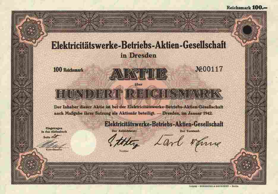TOP Regionale Energie - Aktie ### !!! #### Orginalaktie -- siehe Archivbild -- Elektricitätswerke-Betriebs-AG, Dresden (Sachsen). Aktie über 100 RM vom Januar 1942. Stromerzeuger; Versorgungsgebiet: Stadt Schmölln (Thüringen), soweit von der Gesellschaft versorgt, 11 900 Einwohner und Stadt Gößnitz (Kr. Altenburg), soweit von der Gesellschaft versorgt, 6260 Einwohner. Gründung am 09.04. bzw. 29.05.1900 mit Wirkung ab 01.01.1900 und am 11.06.1900 eingetragen. Großaktionär um 1945: AG Sächsische Werke in Dresden (88%). Aktie im A 4 Format --bestens geeignet für jeden Bilderrahmen !!!
