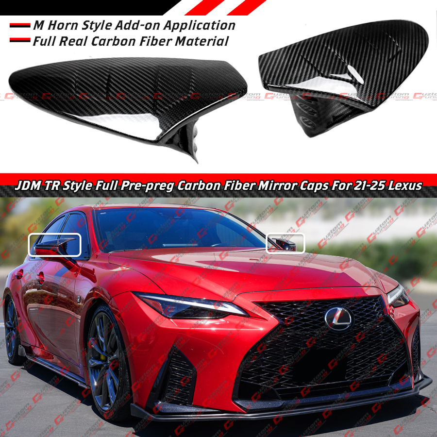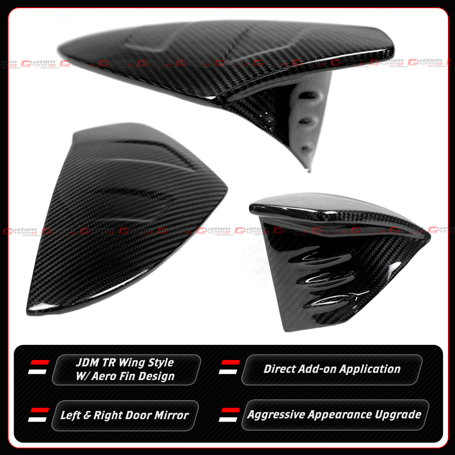 - Full Dry Carbon Fiber JDM TR Style Mirror Caps With Special Aero Fins Design On The Side Of The Covers.