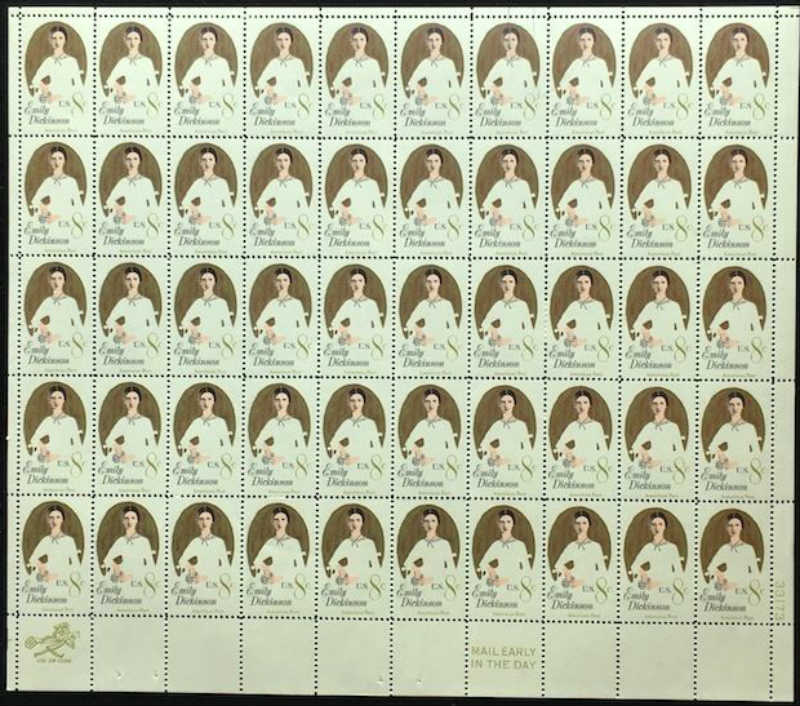 This is a beautiful sheet of 50 stamps, issued by the United States in 1971, commemorating the birth of American poet Emily Dickinson. It is Scott catalog #1436, and is mint never hinged in pristine condition.