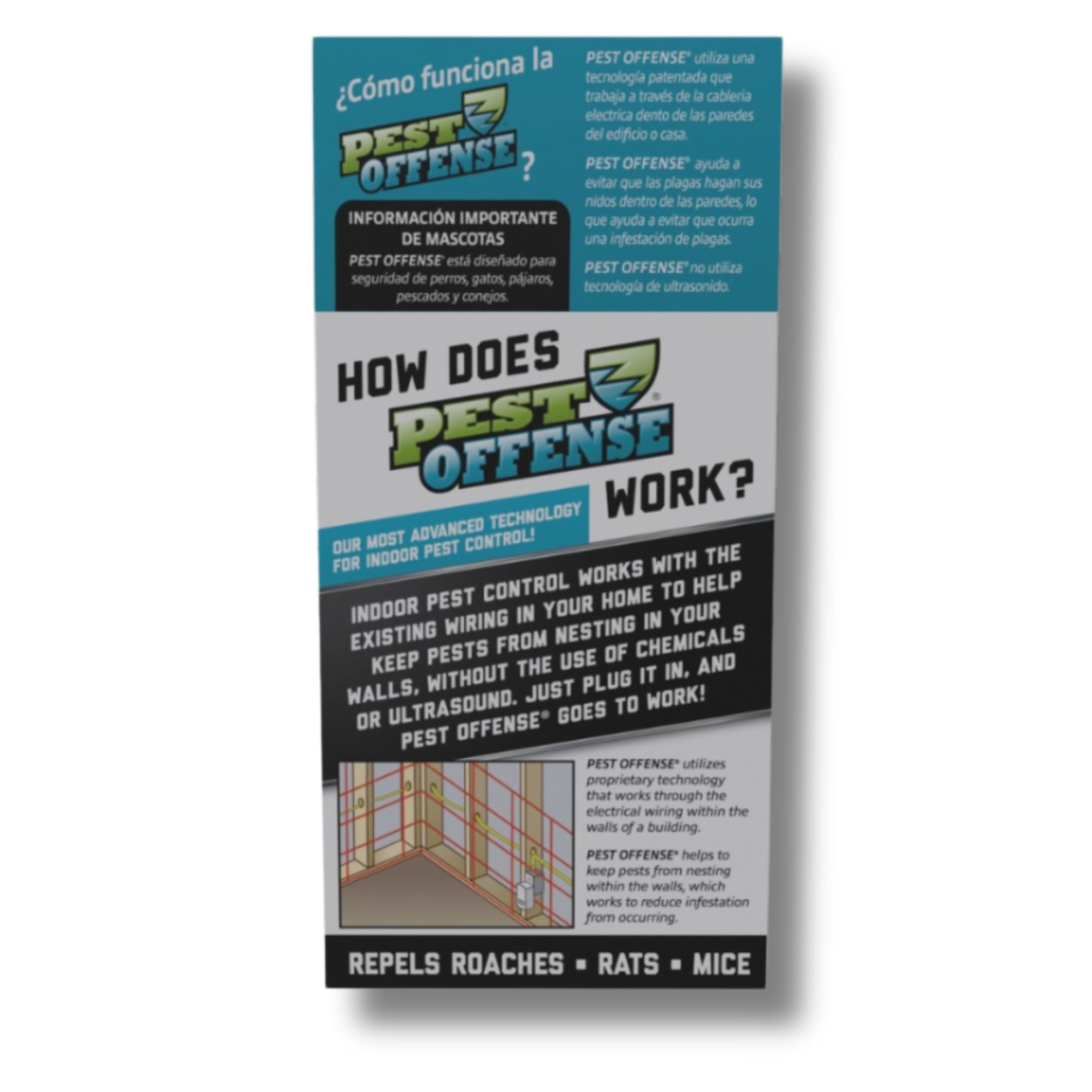 The Original PEST OFFENSE is an environmentally friendly indoor electronic pest repellant designed to deter pests from nesting within the walls of your building. Effective against mice rats and roaches this device helps keep your home free from unwanted pests. With proprietary software the PEST OFFENSE. creates a protective force field within the walls by emitting electronic signals through the wiring. Simply plug the device into a 110V outlet and it will cover one level of an average size home approximately 1800 square feet. Ideal for use in dorm rooms apartments or houses.
