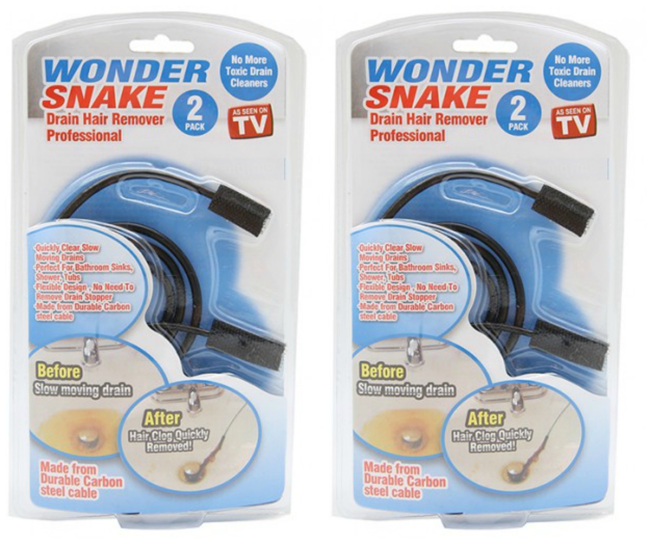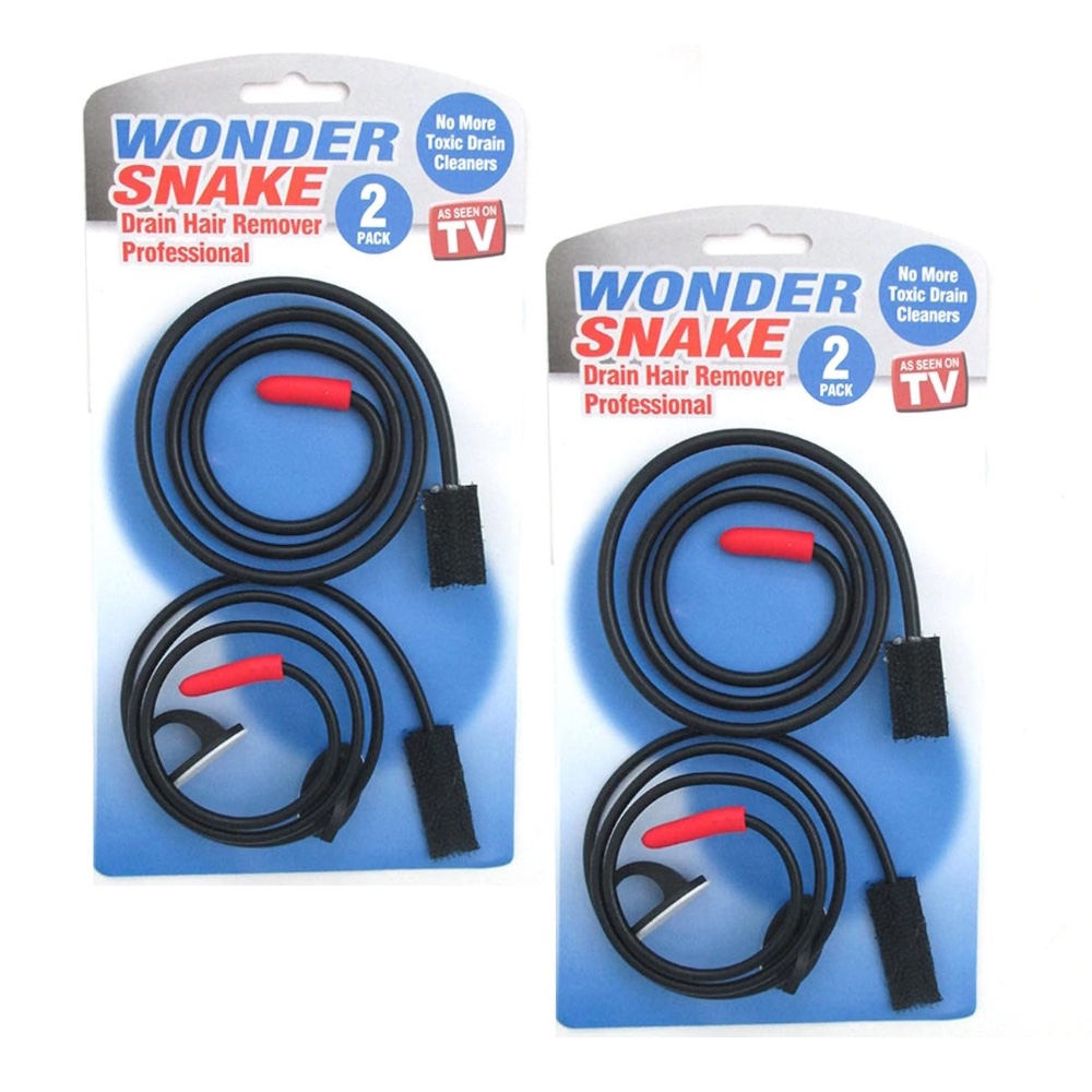 The Wonder Snake Drain Hair Remover is the fast and simple way to clear slow-moving drains! Easily place down the drain, twist to capture all the hair and remove from the drain. The Wonder Snake Drain Hair Remover's designed head captures and locks onto hair clogs to remove and clear the drain right away. The flexible design simply moves down the drain to look for clogs without having to remove the drain stopper.