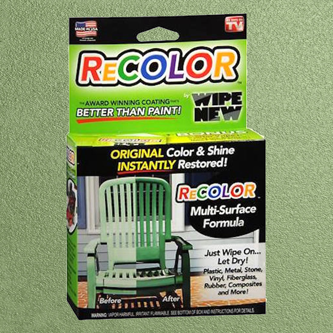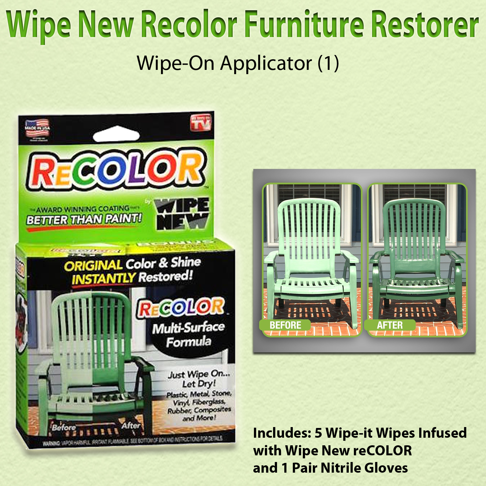 ReColor by Wipe New offers a wipe-on clear coat that saves both time and money compared to traditional paint. It restores surfaces to their original color with a perfect match every time, while the easy wipe-on application eliminates messy paint drips, brush marks, and overspray. Achieve a flawless factory finish on any surface in just minutes, at a lower cost per square foot than paint. ReColor's performance is backed by an award-winning brand known for its innovative, long-lasting products. The kit includes 5 Wipe-it Wipes infused with ReColor and 1 pair of nitrile gloves.