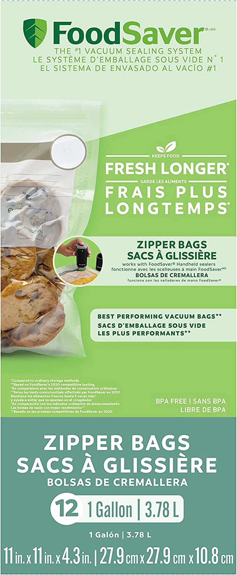 FoodSaver FreshSaver Gallon Zipper Bags are ideal for storing frequently accessed foods in the refrigerator or pantry. Use FoodSaver® FreshSaver® zipper bags to store deli meats, cheeses, dried or fresh fruits, nuts and snacks, baked goods, cookies and more. The gallon-sized zipper bags feature a convenient gusseted bottom that lays flat on a counter or table top for easy filling. Each bag is constructed of durable, BPA-free, multi-layer plastic to help keep air out so foods stay fresher, longer.