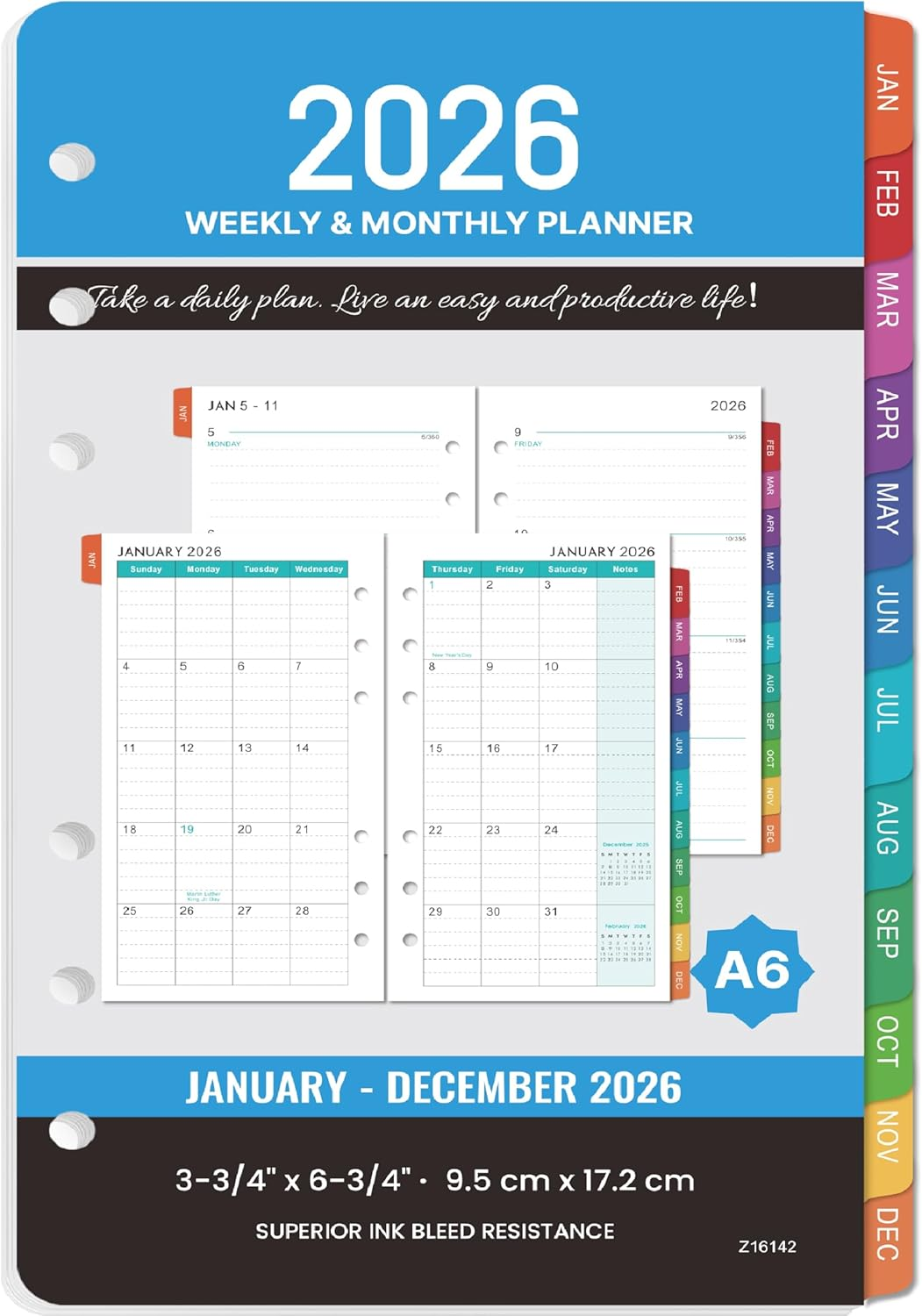 2026 Planner Refills - A6 Weekly and Monthly Planner Inserts, 4" X 6.73", Jan. 2026 - Dec. 2026, Planner Refills 2026, 6 Holes, Colorful Monthly Tabs
