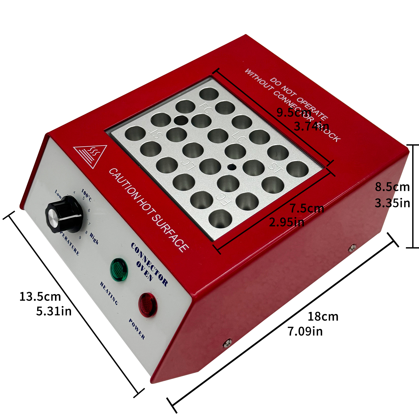 This portable compact fiber curing oven is designed for easy field installation, compatible with SC/FC/ST/LC connectors and capable of simultaneously heating and curing up to 24 fiber optic connectors to significantly improve work efficiency. Equipped with time control and heating indicators, it precisely regulates heating duration to ensure uniform curing. The unit offers customizable curing fixtures and heating plates with various core counts and specifications to meet specific customer requirements.
