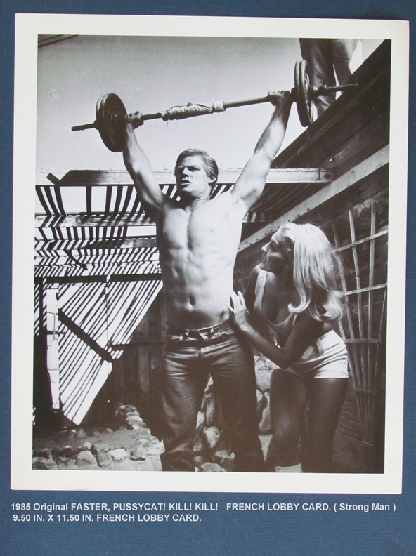 1985 Original FASTER, PUSSYCAT! KILL! KILL! FRENCH LOBBY CARD. ( Strong Man ) 9.50 IN. X 11.50 IN. FRENCH LOBBY CARD. Faster, Pussycat! Kill! Kill!, the classic 1965 Russ Meyer ("who brought you 'Lorna' and 'Motorpsycho'") sexploitation action crime thriller ("Don't race the fastest PUSSYCATS - they'll beat you - to DEATH!"; "GO-GO for a WILD RIDE with the ACTION GIRLS!"; "Superwomen! Belted, buckled and booted!") starring Tura Satana, Haji, Lori Williams, Sue Bernard (billed as "Susan Bernard"), Stuart Lancaster, Paul Trinka, Dennis Busch, Ray Barlow, and Mickey Foxx. The envelope it came in is not included. It helps denote the LC original.