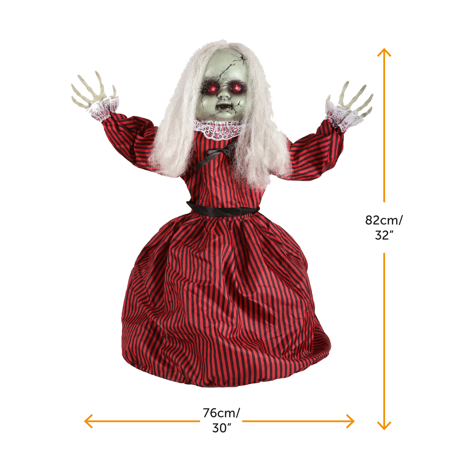 LARGE DOLL DECORATION MEASUREMENTS: Your Animated Large Walking Doll Animated Decoration prop is a 82cm/32” x 76cm/30”, a large Halloween Decoration that will be sure to get noticed as it moves across the ground to terrify!