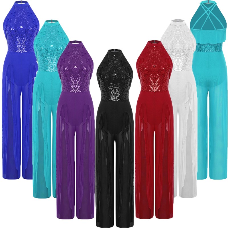The ankle length gymnastics jumpsuit for women ensure total movement and flexibility when leaping, dancing or tumbling.