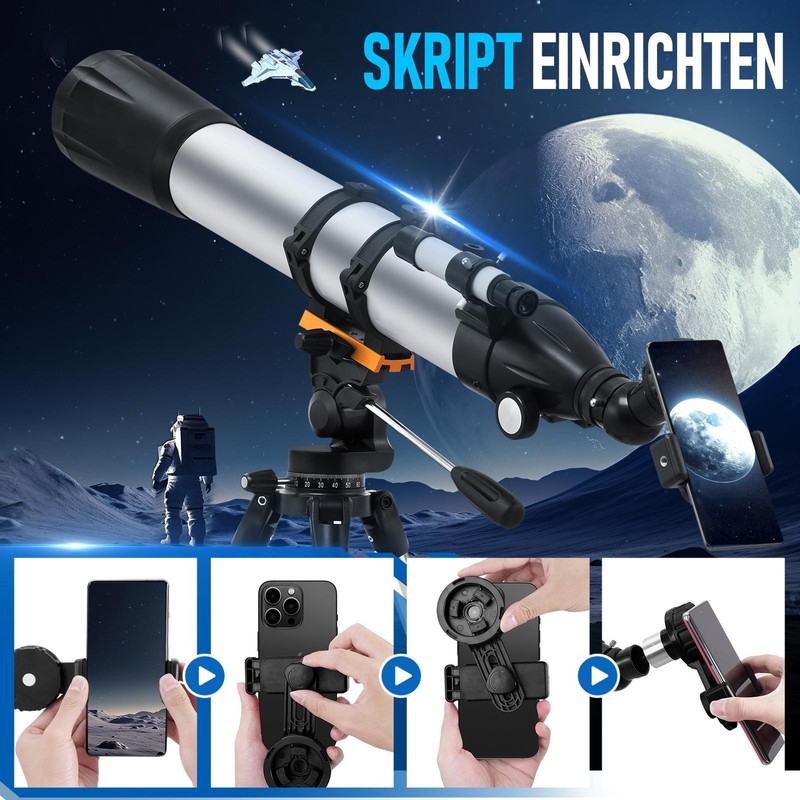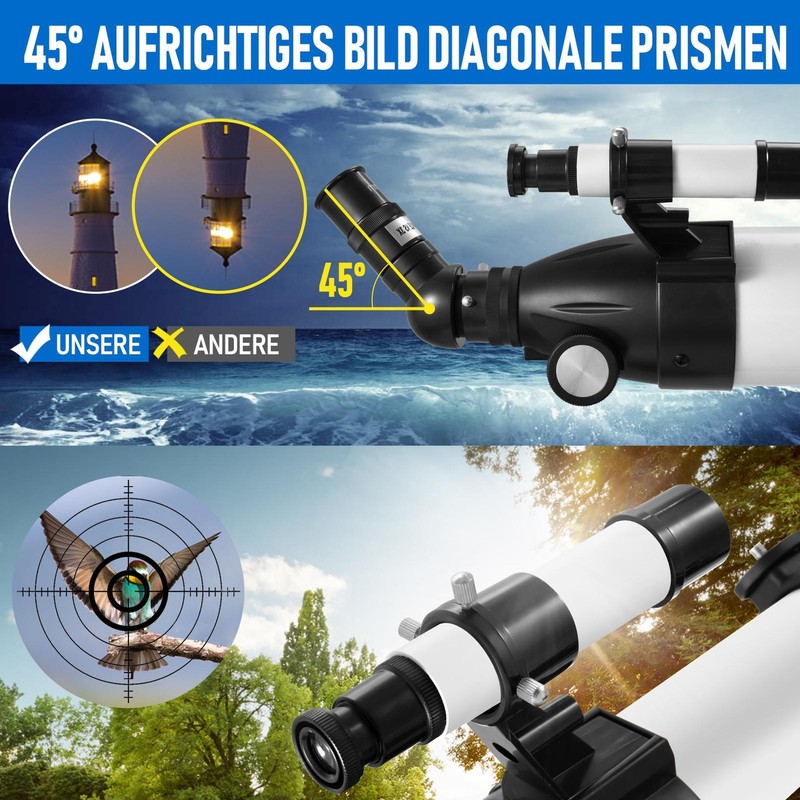 【90 mm große Blende】 Dieses professionelle astronomische Teleskop verfügt über eine F-MC-Technologie mit 900 mm Brennweite und 90 mm Blende. Die große Blende ermöglicht eine hohe Lichtdurchlässigkeit und liefert klare, kontrastreiche Bilder. Ideal für die Beobachtung von Sternen, Mond, Himmelskörpern, Tieren und Outdoor-Szenen.