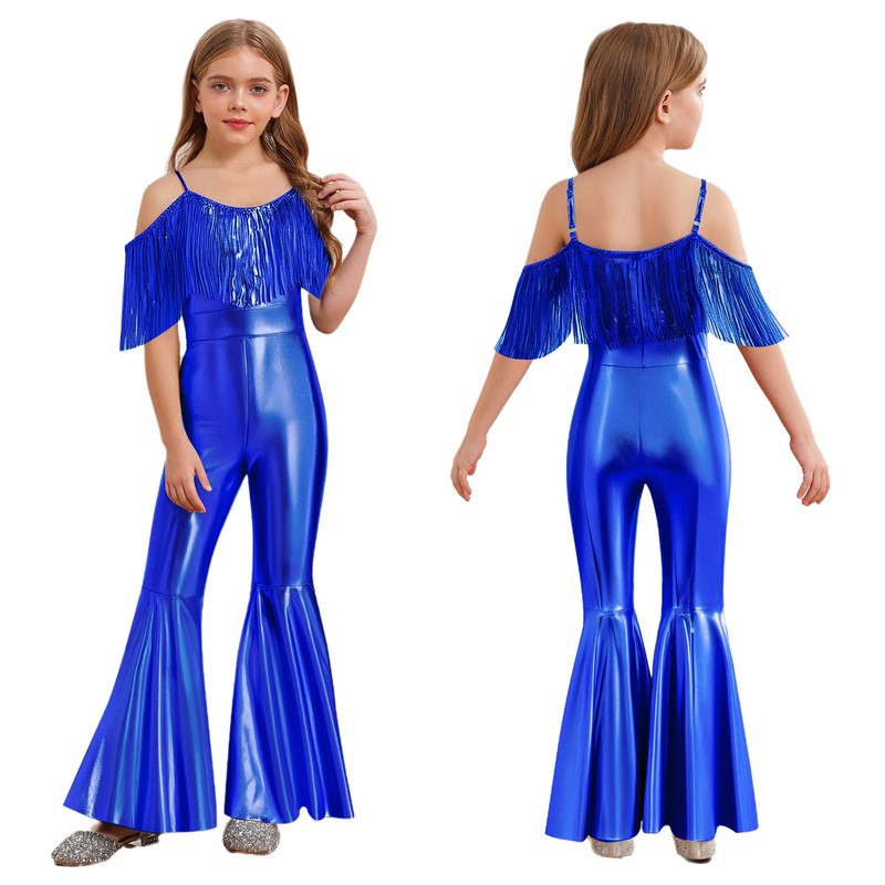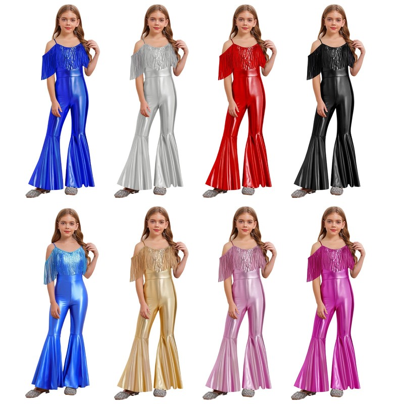 Kids Girls Straps Flared Disco Jumpsuits Hippie Fancy Dress Up Fringed Cosplay