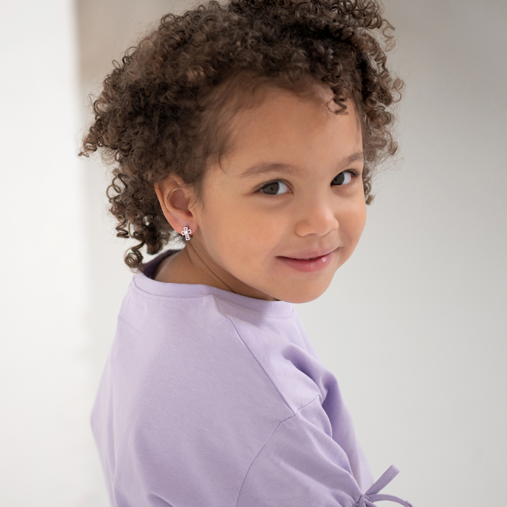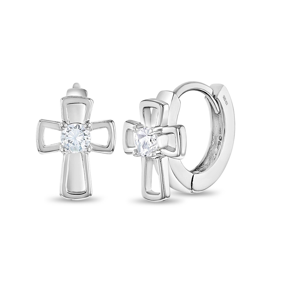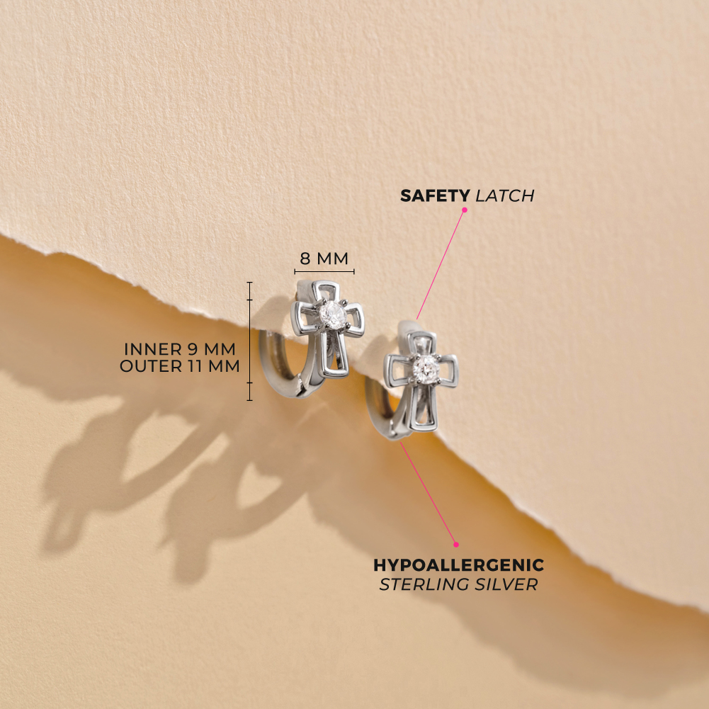 These little girls' and kids' religious hoop earrings serve as a reminder of faith and a gentle call to prayer, which is an especially great gift idea for children who are growing in their knowledge of the faith. This catholic jewelry includes a pair of cross hoop earrings for kids with tiny round cubic zirconia stone in the center. Entirely made of 925 sterling silver which makes a perfect gift for a christening, baptism, holy communion, or confirmation. A gift box is included.