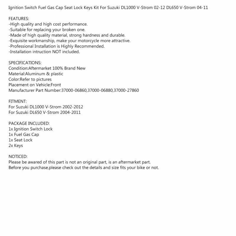 Ignition Switch Fuel Gas Cap Seat Lock Keys Kit Fit for Suzuki DL1000 V-Strom 02-12 DL650 V-Strom 04-11