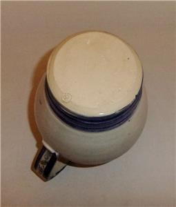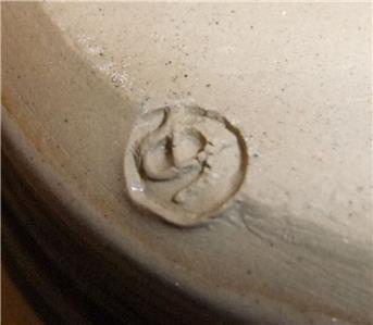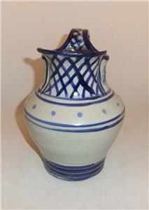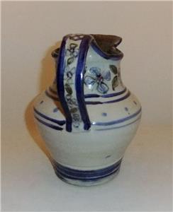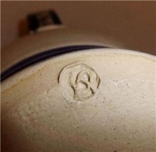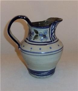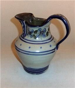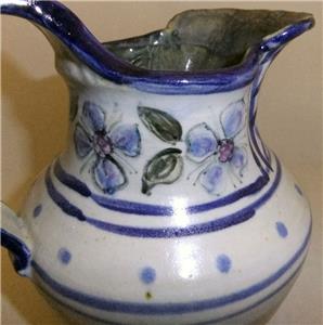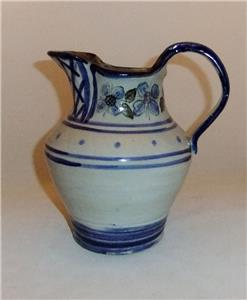A very handsome and large studio pottery jug, hand thrown in stoneware and decorated with flowers in underglaze colours. There is a seal mark, which looks very like the mark of Evelyn Papp, and the style of the painting is very like other pots of hers that I have seen, however one thing leads ne to doubt the attribution: this is potted in a high fired white stoneware, and I understood that she usually potted in a tin glazed earthenware using a red clay - still, there it is, as good a jug as you are likely to find anywhere..