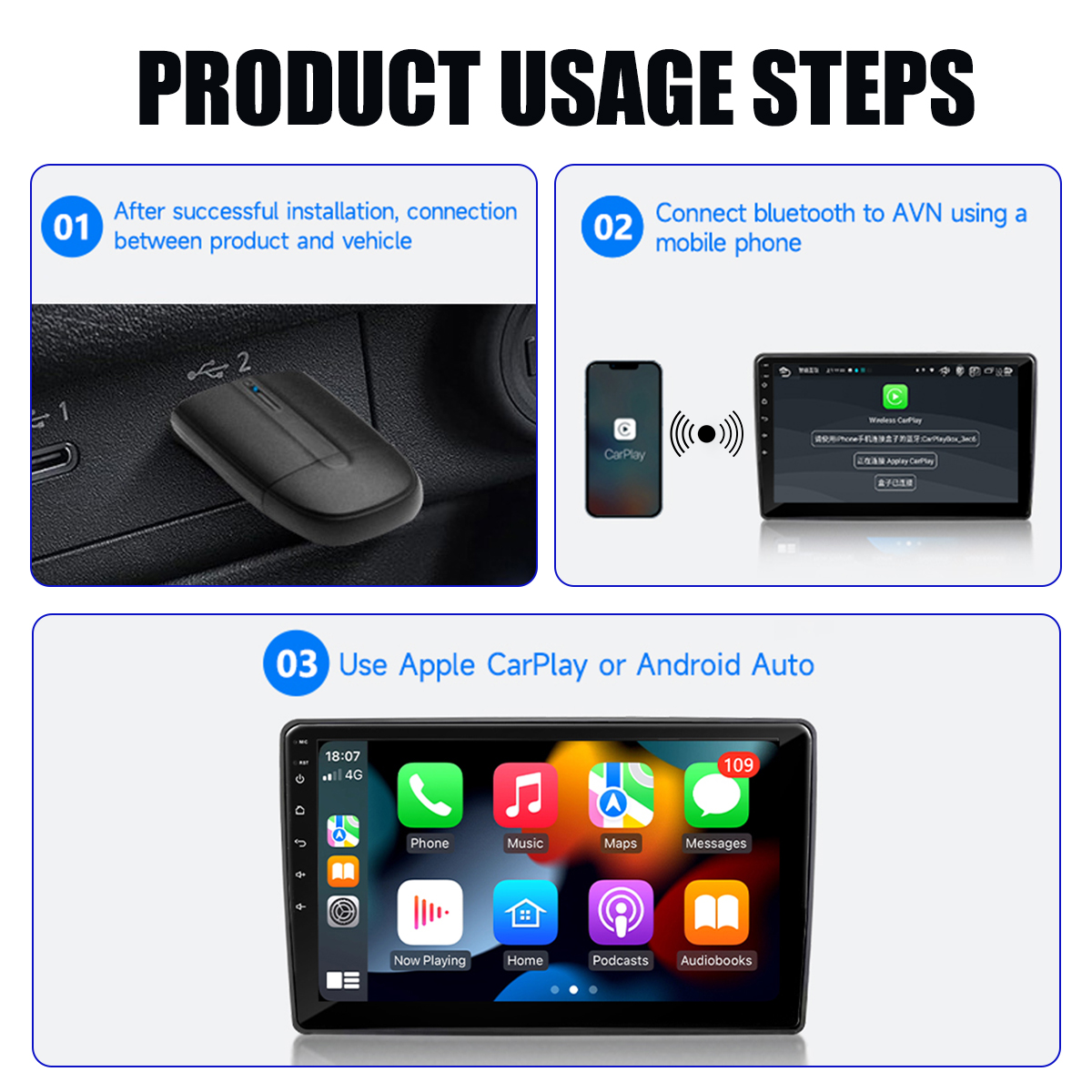 1. Wired to wireless CarPlay adapter, say goodbye towires.USB plug-and-play installation, stable and fast,no need to remove OEM radio
