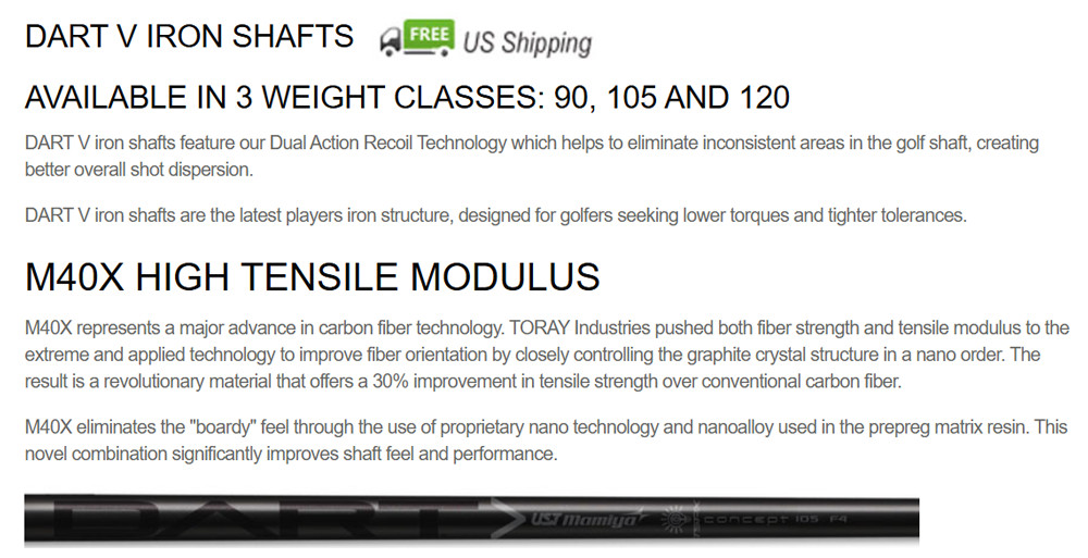 DART V iron shafts feature our Dual Action Recoil Technology which helps to eliminate inconsistent areas in the golf shaft, creating better overall shot dispersion.