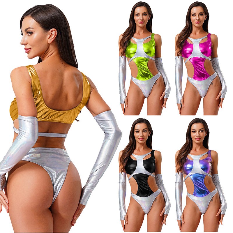 Contrast color and hollow-out details on the sleeveless bodysuit create a bold and fashionable look, perfect for making a statement.