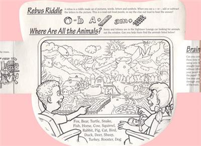 Train conductors used to hand these out to children. It comes flat and forms to shape when worn; adjustable to fit seven different sizes. On the back are several games for kids (a maze, find the animals, rebus riddle, etc). Neat item that you don't see for sale very often!