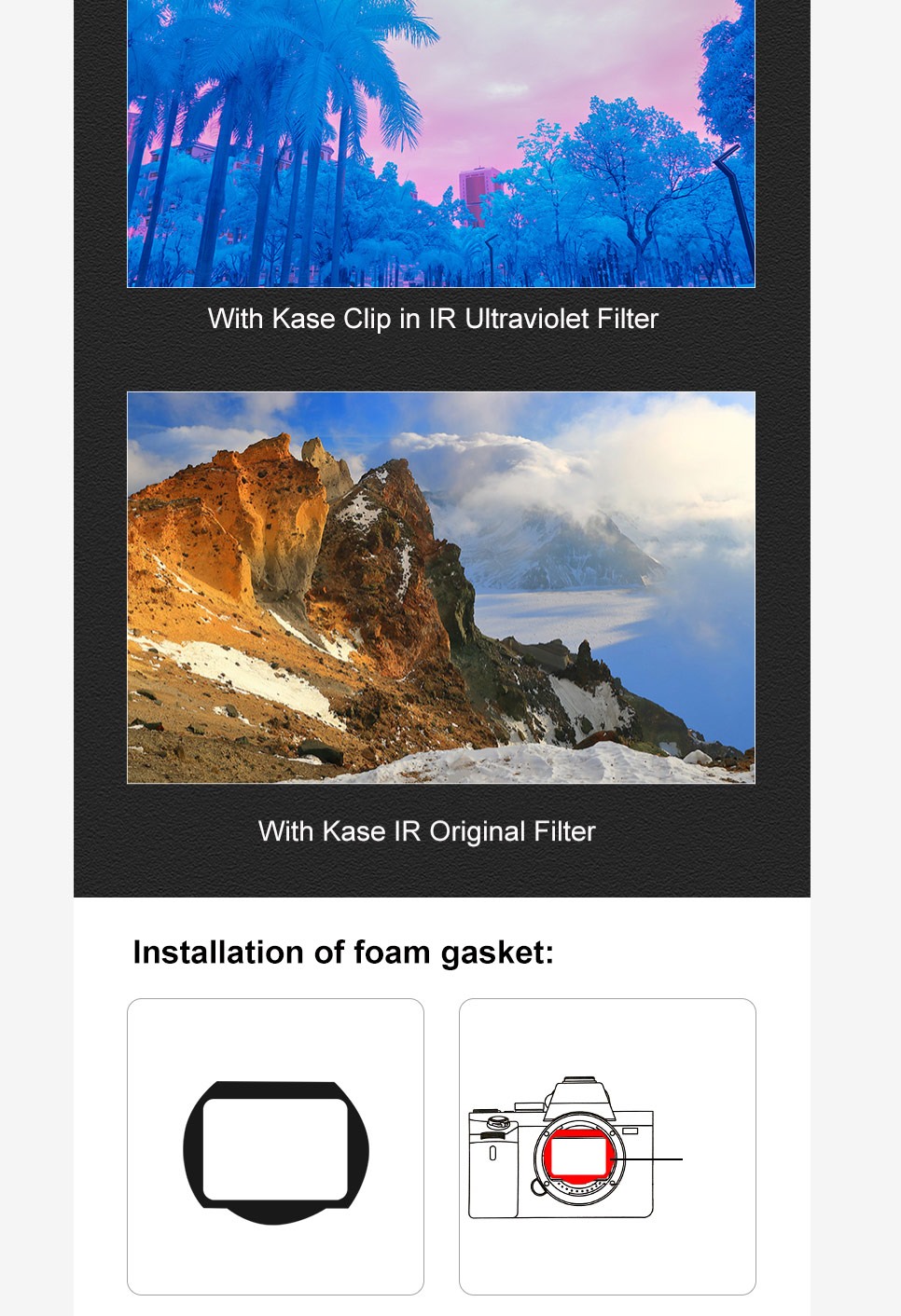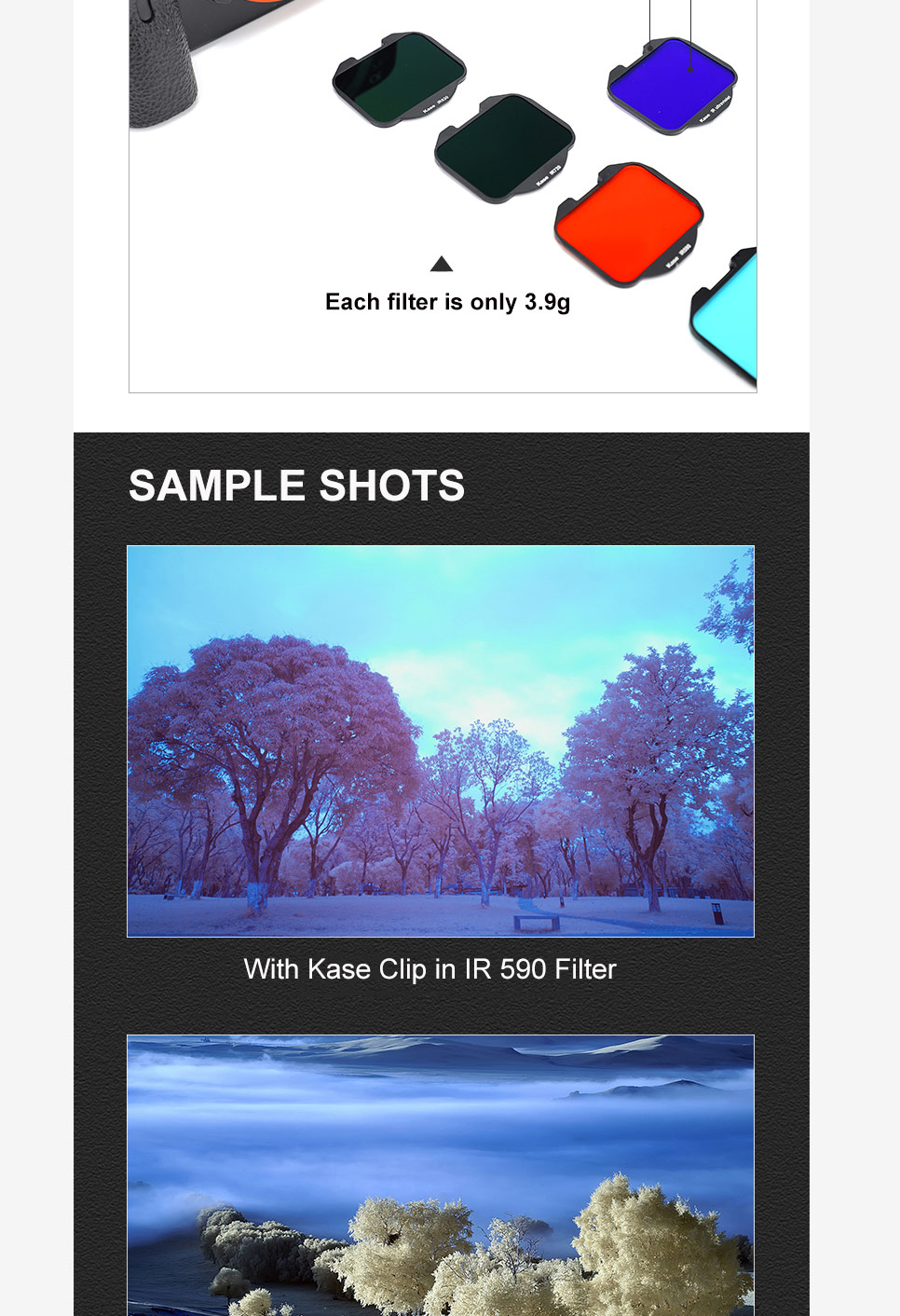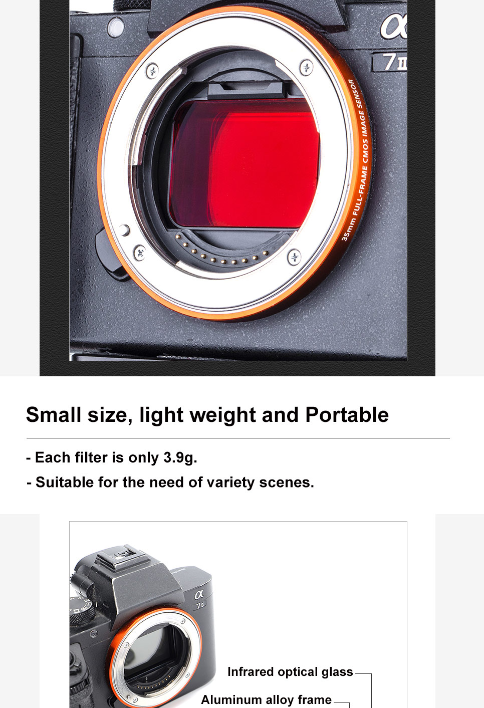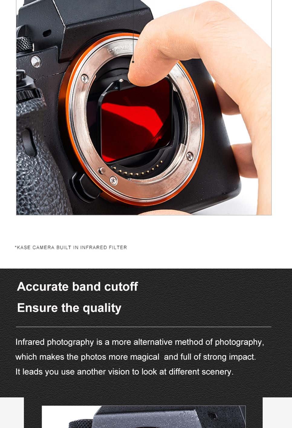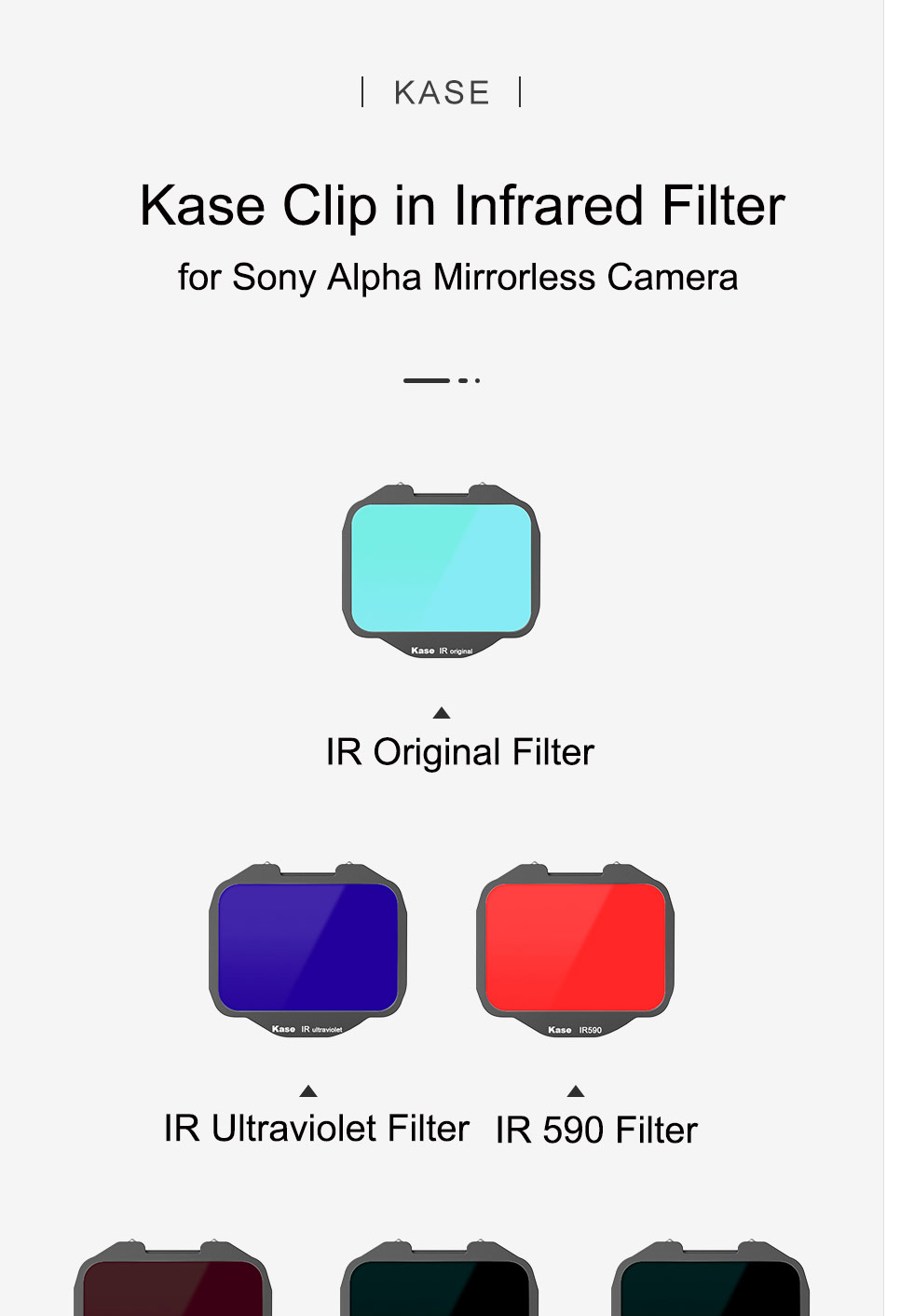 The IR 665 Infrared Filter for Sony Alpha Cameras from Kase is a clip-in filter for cameras including the a7S, a7R, and a9. Filtering out light below the wavelength of 665nm in the light spectrum, it allows you to capture the portion of the spectrum above this wavelength, where colors are invisible to the naked eye. It also ensures there's no vignetting in your image.