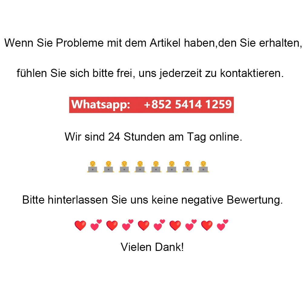 Logistik-Pünktlichkeit: Unter normalen Umständen werden die Waren innerhalb der geschätzten Zeit geliefert. Bei Gewaltverhältnissen wie Wetterphänomenen, Verkehrsstörungen oder Naturkatastrophen kann die Lieferung jedoch verzögert sein. Sollte eine Verzögerung auftreten, bleiben Sie bitte ruhig. Sie können die Logistikinformationen über die Bestelldetailseite überprüfen oder uns jederzeit per Kundenservice kontaktieren. Wir verfolgen den Logistikfortschritt und koordinieren die Problembehandlung.