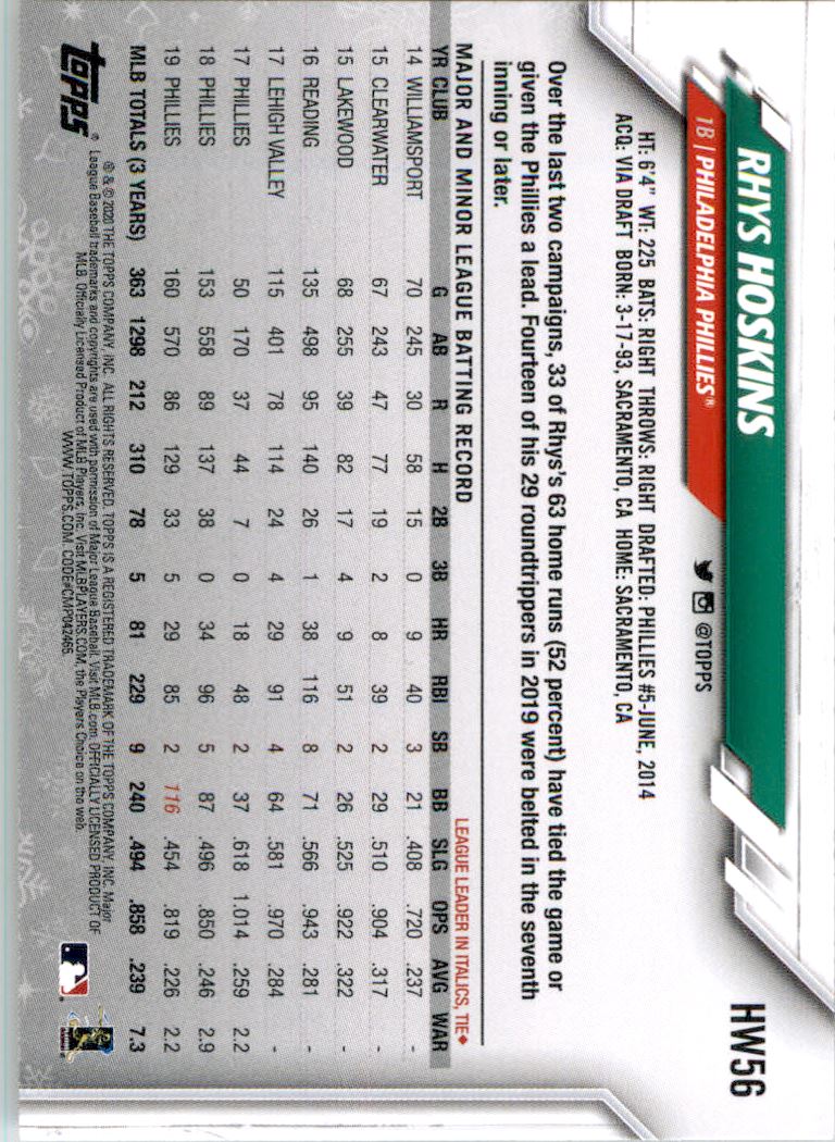2020 Topps Walmart Holiday Baseball Card #HW56 Rhys Hoskins